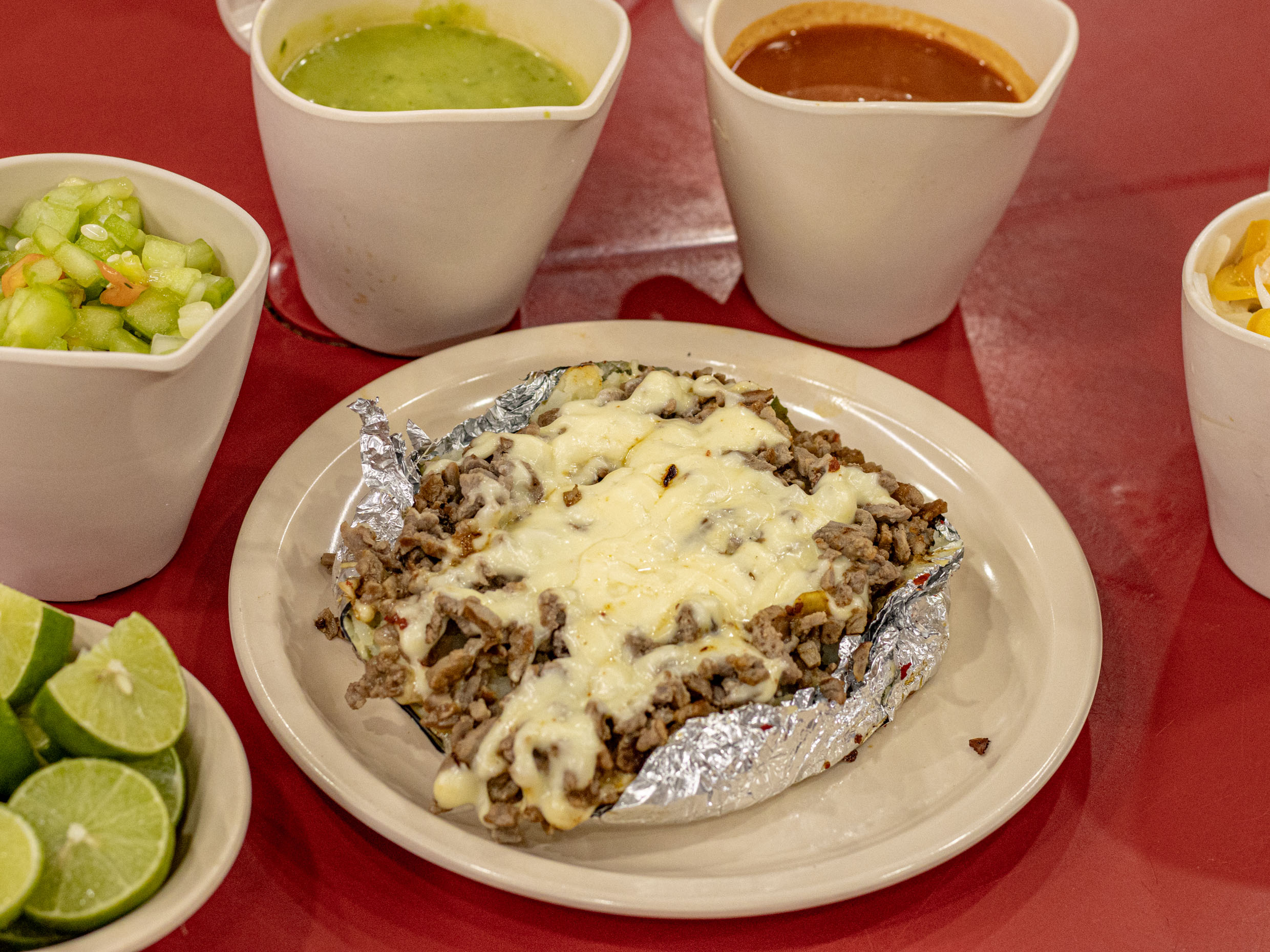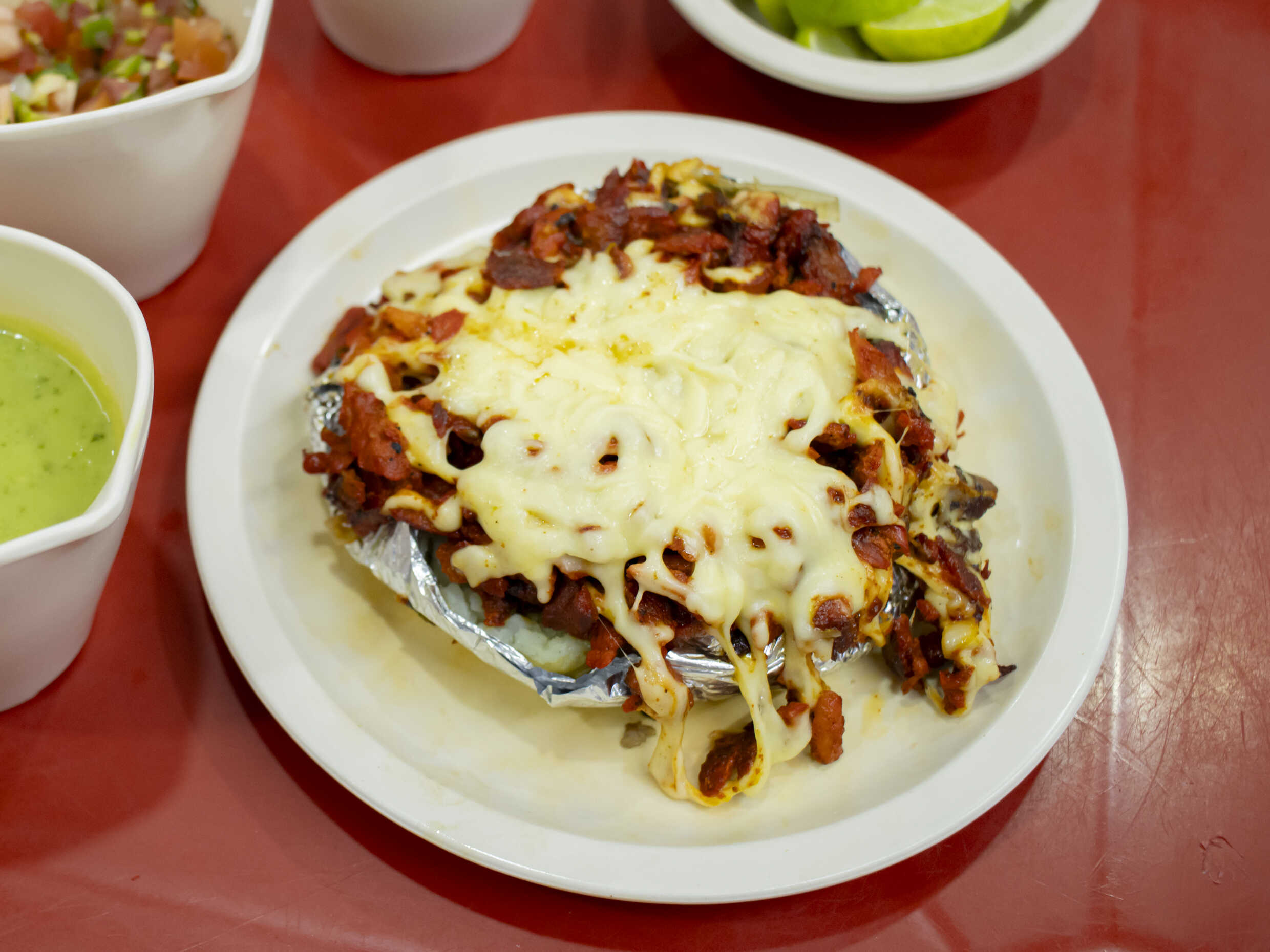 Cebolla, morrón, tocino, pastor, bistec, pechuga, aguacate y queso.