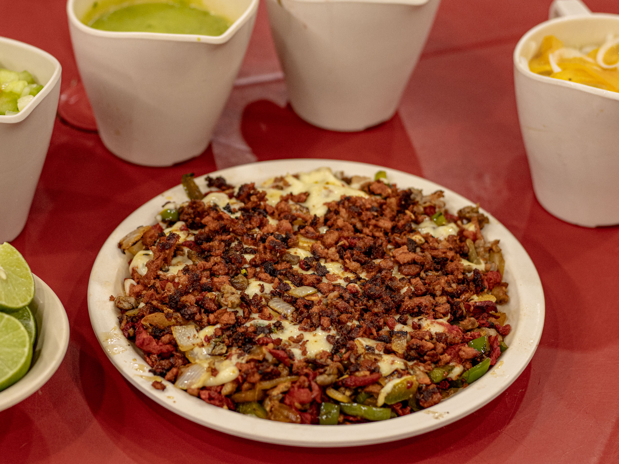 Cebolla, morrón, jitomate, tocino, pastor, bistec y queso.