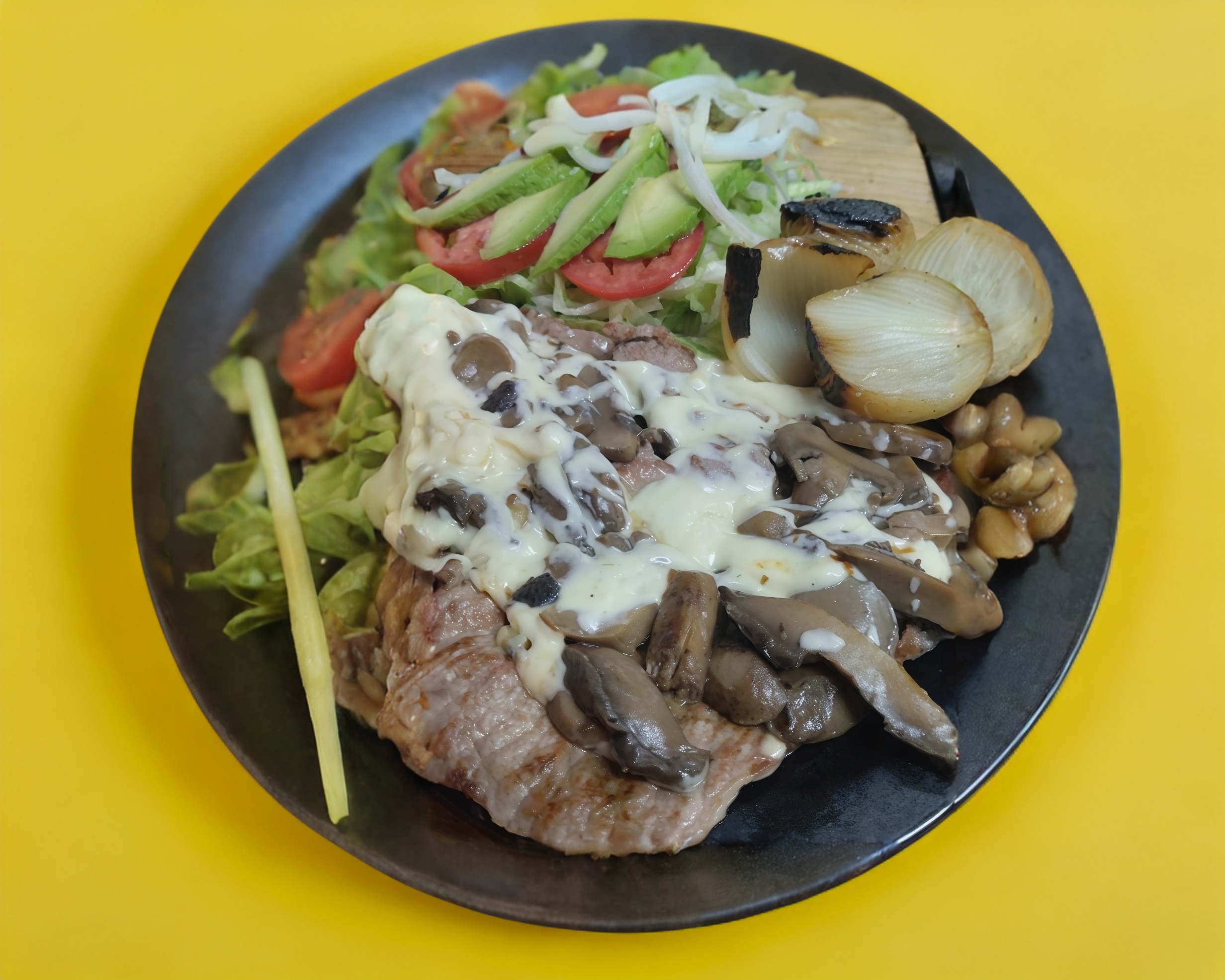 Bistec de res asado con champiñones y queso gratinado acompañado de ensalada y tortillas de maíz.