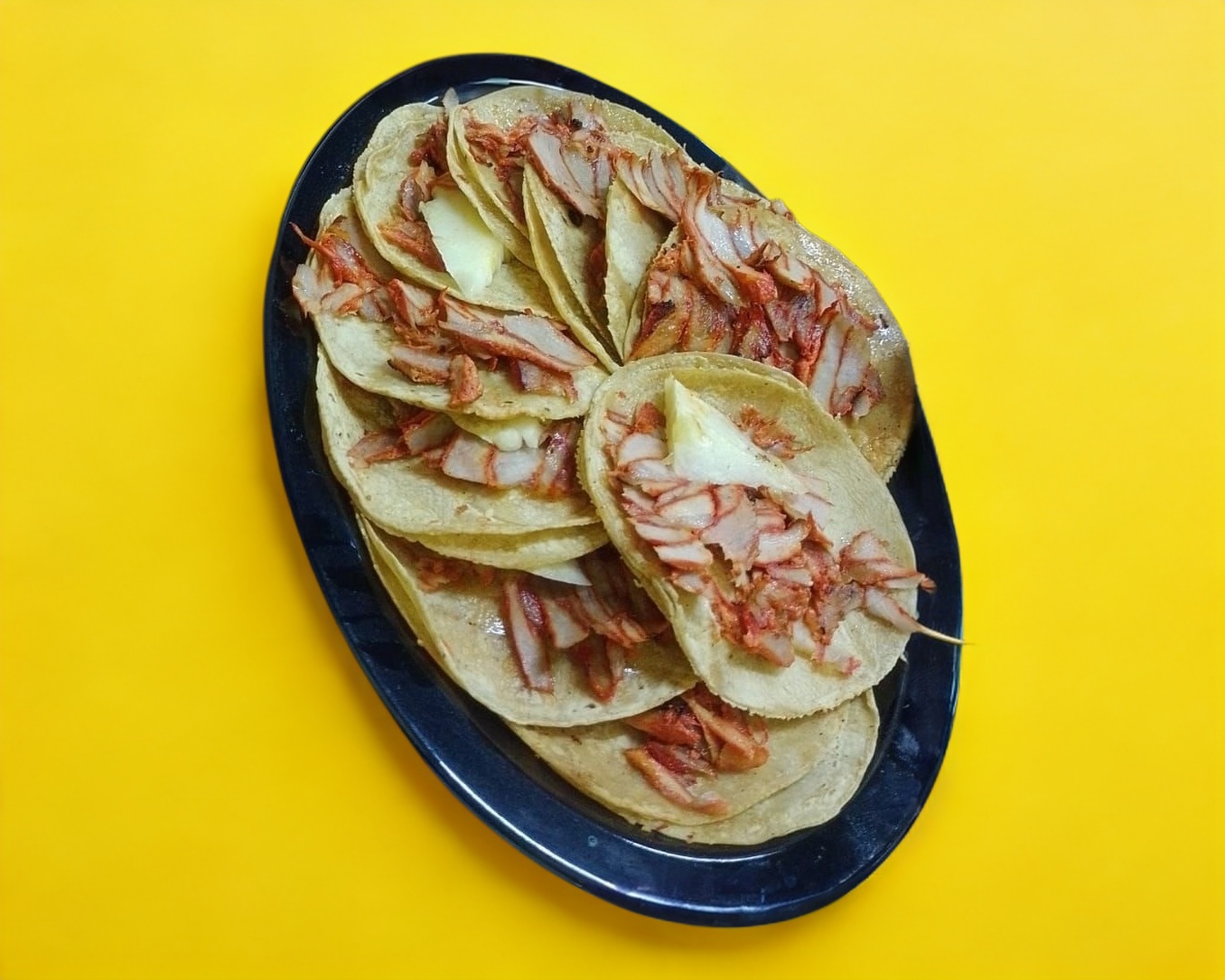 Pastor de puerco, bistec de res, cebolla, pimientos y tocino, acompañado de tortillas de maíz.