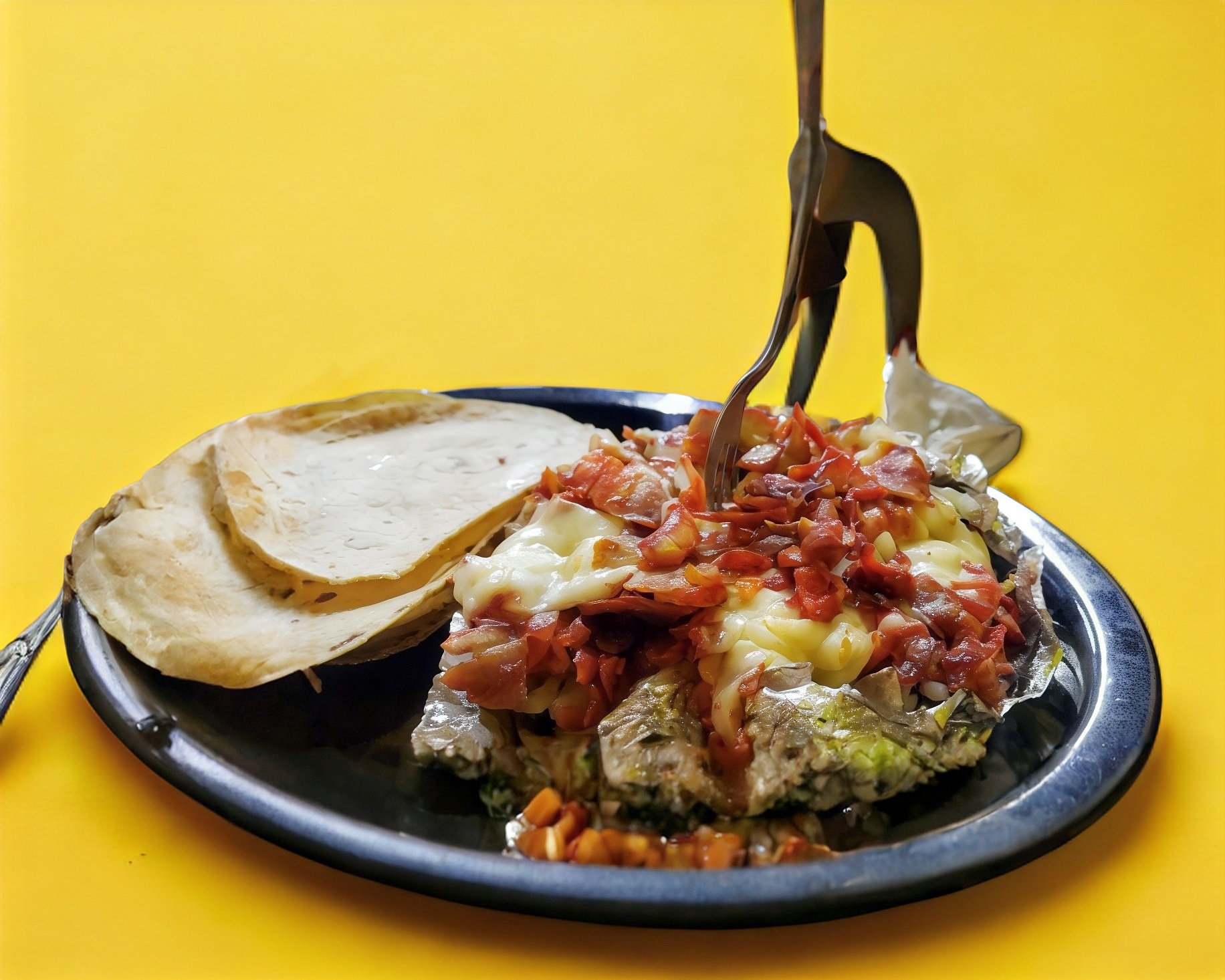 Pastor y bistec de res con cebolla, pimientos, pico de gallo y tocino con queso gratinado acompañado de tortillas de maíz.