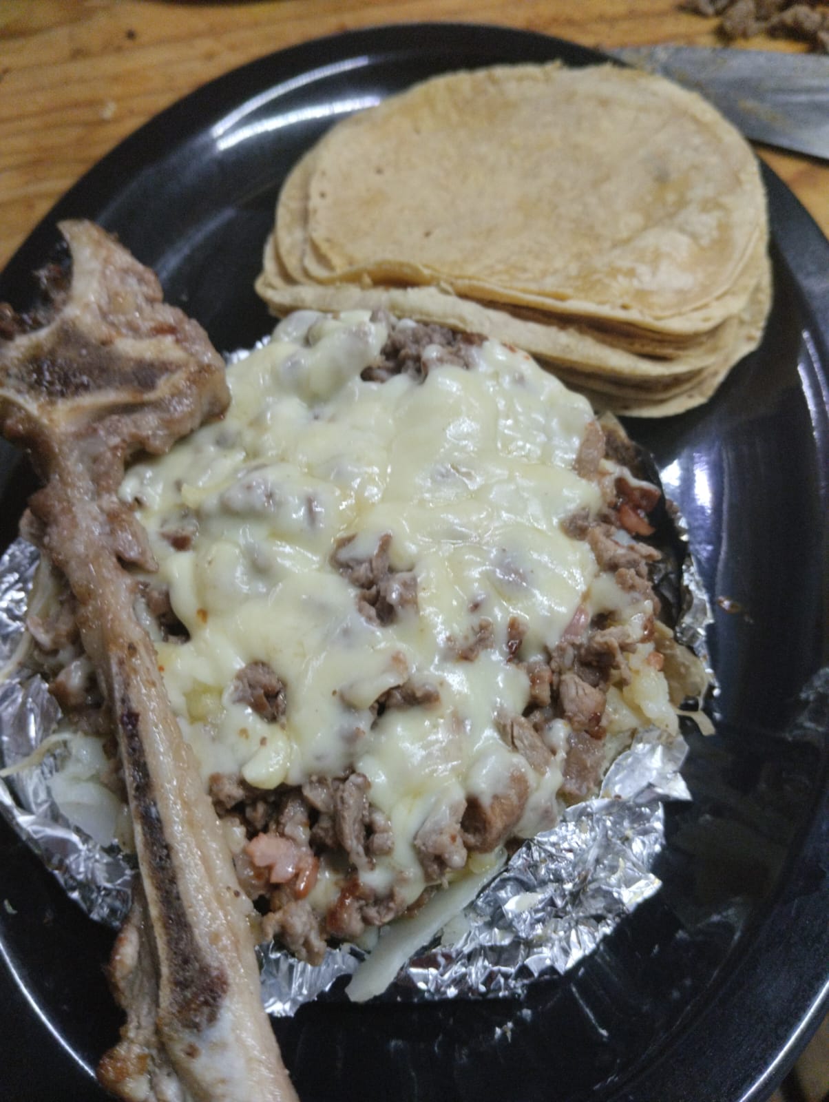 Queso fundido de costilla de res acompañado de tortilla de harina.