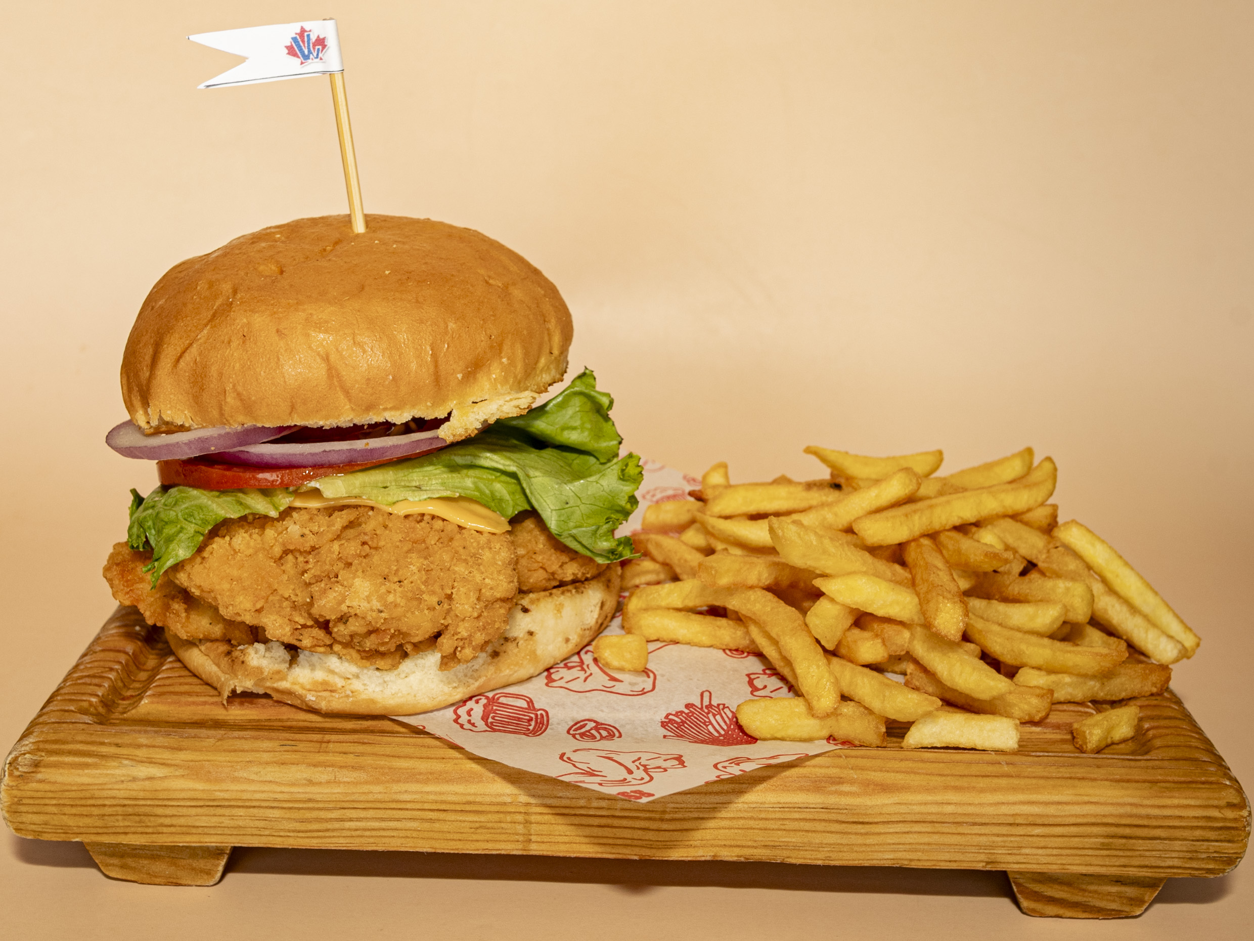 Pechuga empanizada cortada en cubos (150 gr) queso americano, mayonesa, lechuga, jitomate y cebolla, acompañada con papas a la francesa (100gr)