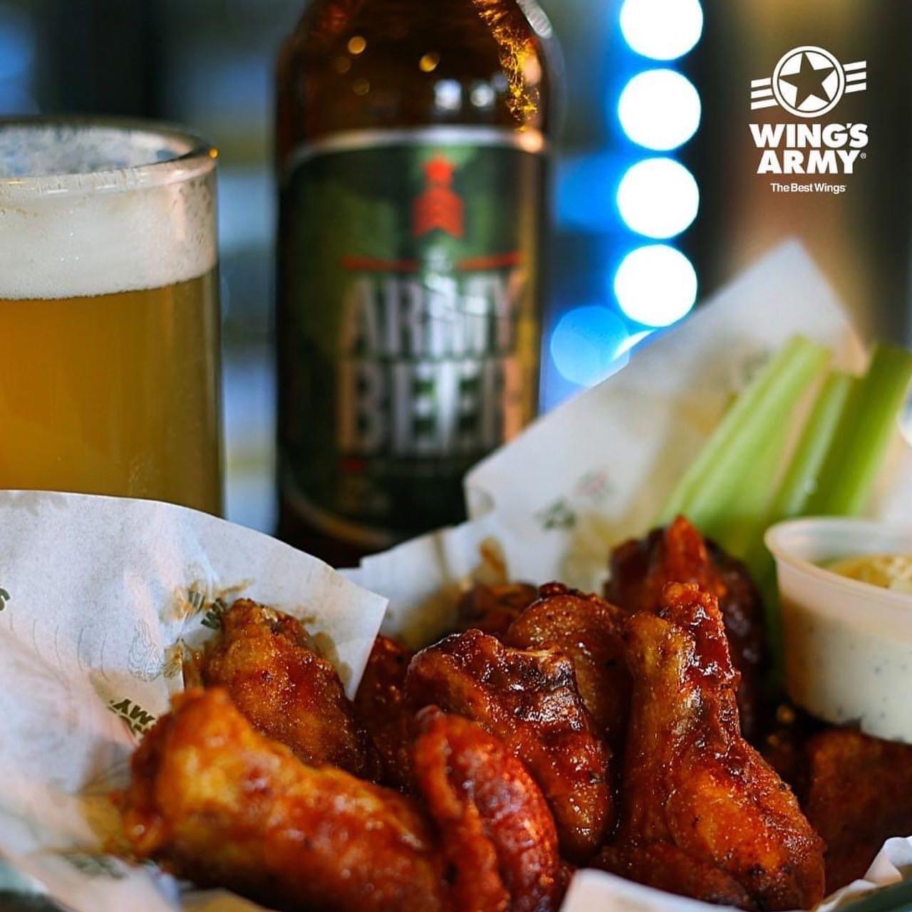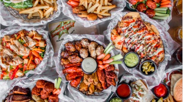 2.5 Kg de alitas (45 pz), 6 dedos de queso, 6 churros de cebolla, 1 orden de papas de 130 gr, 10 aros de cebolla, 160 gr de vegetales, 2 dips grandes de 120ml c/u.