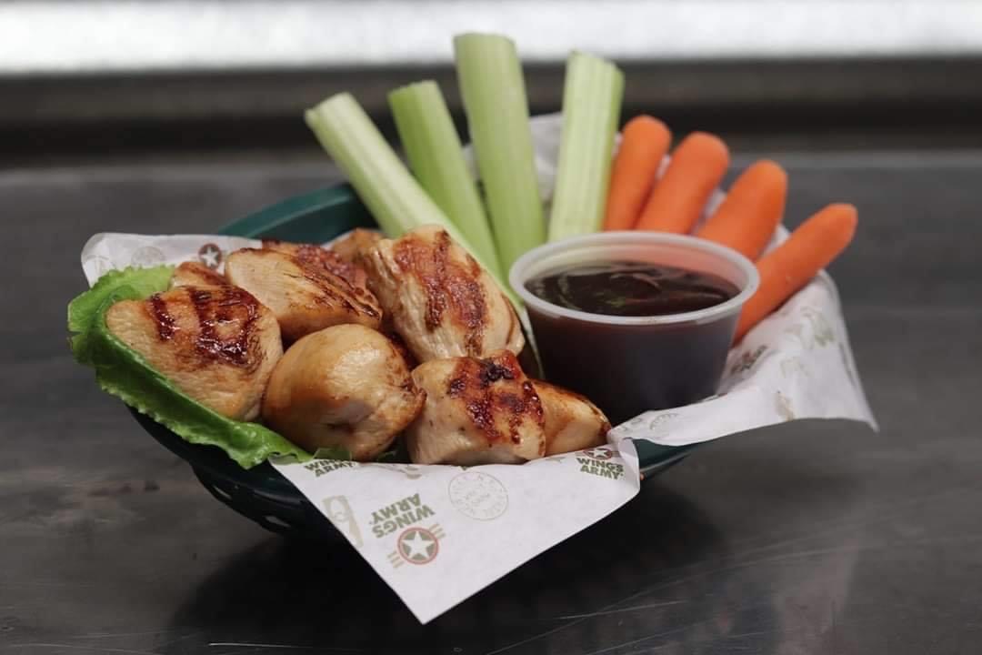 440 gramos de Suaves trocitos de pechuga de pollo empanizados, dorados a la perfección y bañados en cualquiera de nuestras salsas.