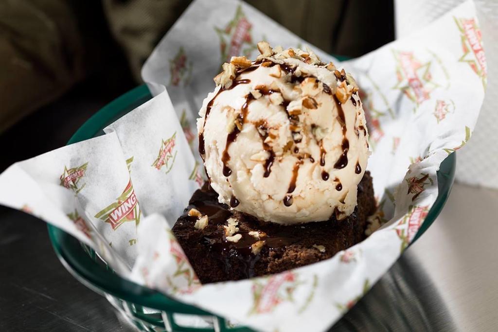 180 gr, Brownie esponjoso y calientito con una bola de helado de vainilla cubierto con chocolate y trocitos de nuez.