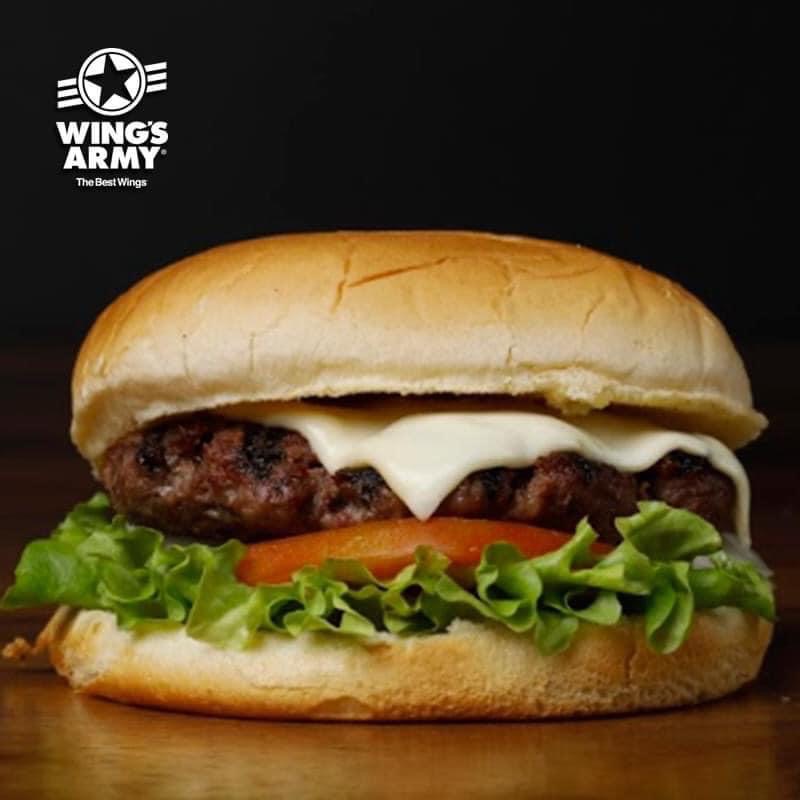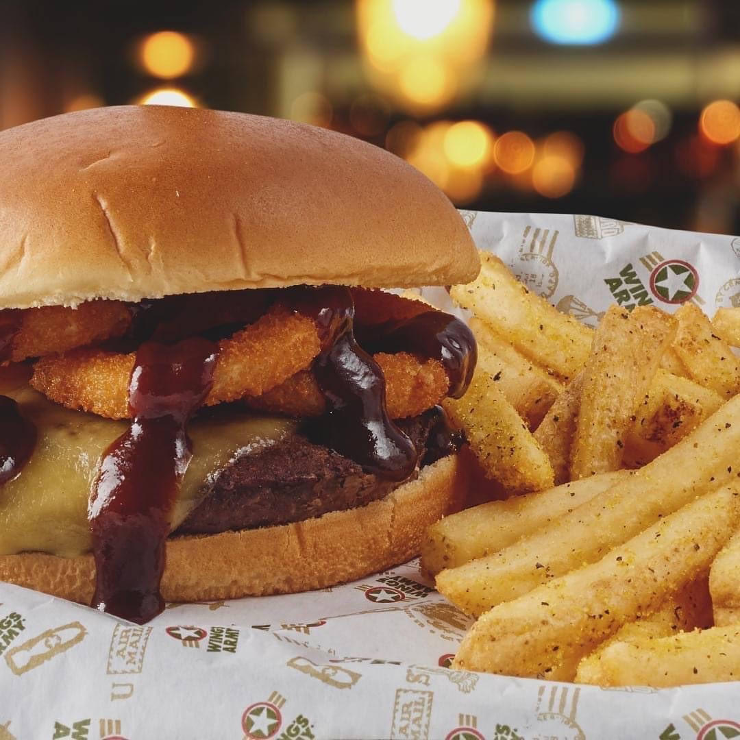 160 gramos de carne de Res, queso blanco, 3 piezas de aros de cebolla y salsa ahumada. Acompañada de 220 gramos de papas de la casa.