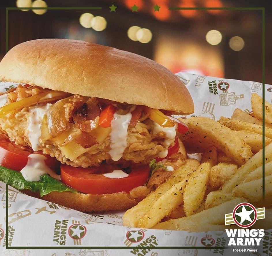 150 gr de Pechuga de pollo empanizada, lechuga, tomate, pimientos, cebolla, queso amarillo, tocino y bañada con aderezo ranch y un toque de salsa Original Hot, acompañada de 130 gr de papas.