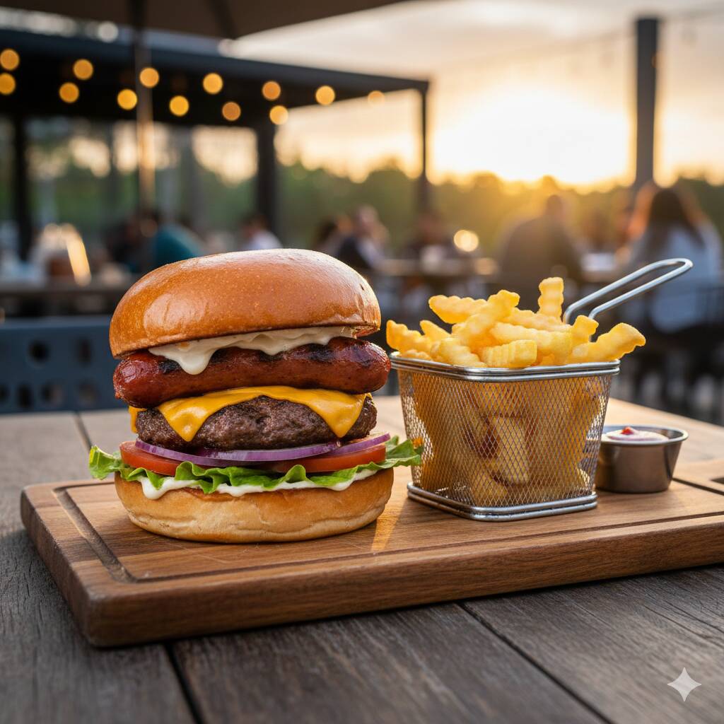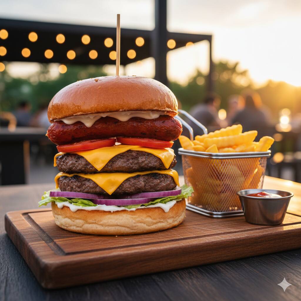 Hamburguesa con su pan brioche, lechuga, doble carne de res(diezmillo), queso, salchicha para asar, jitomate, cebolla, mayonesa, papas a francesa