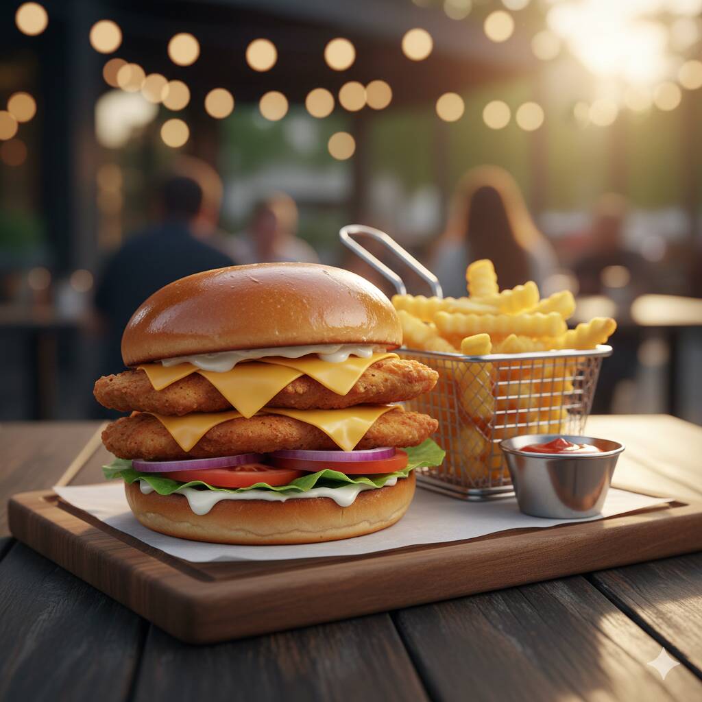 Hamburguesa con su pan brioche, lechuga, tenders de pollo, queso, jitomate, cebolla, mayonesa, papas a francesa
