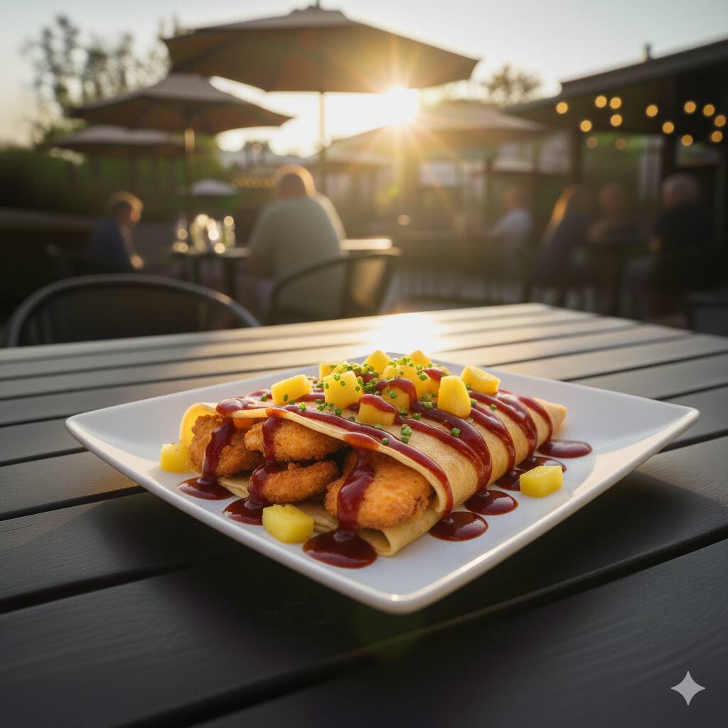 Crepa con BONELESS, PIÑA, salsa BBQ.