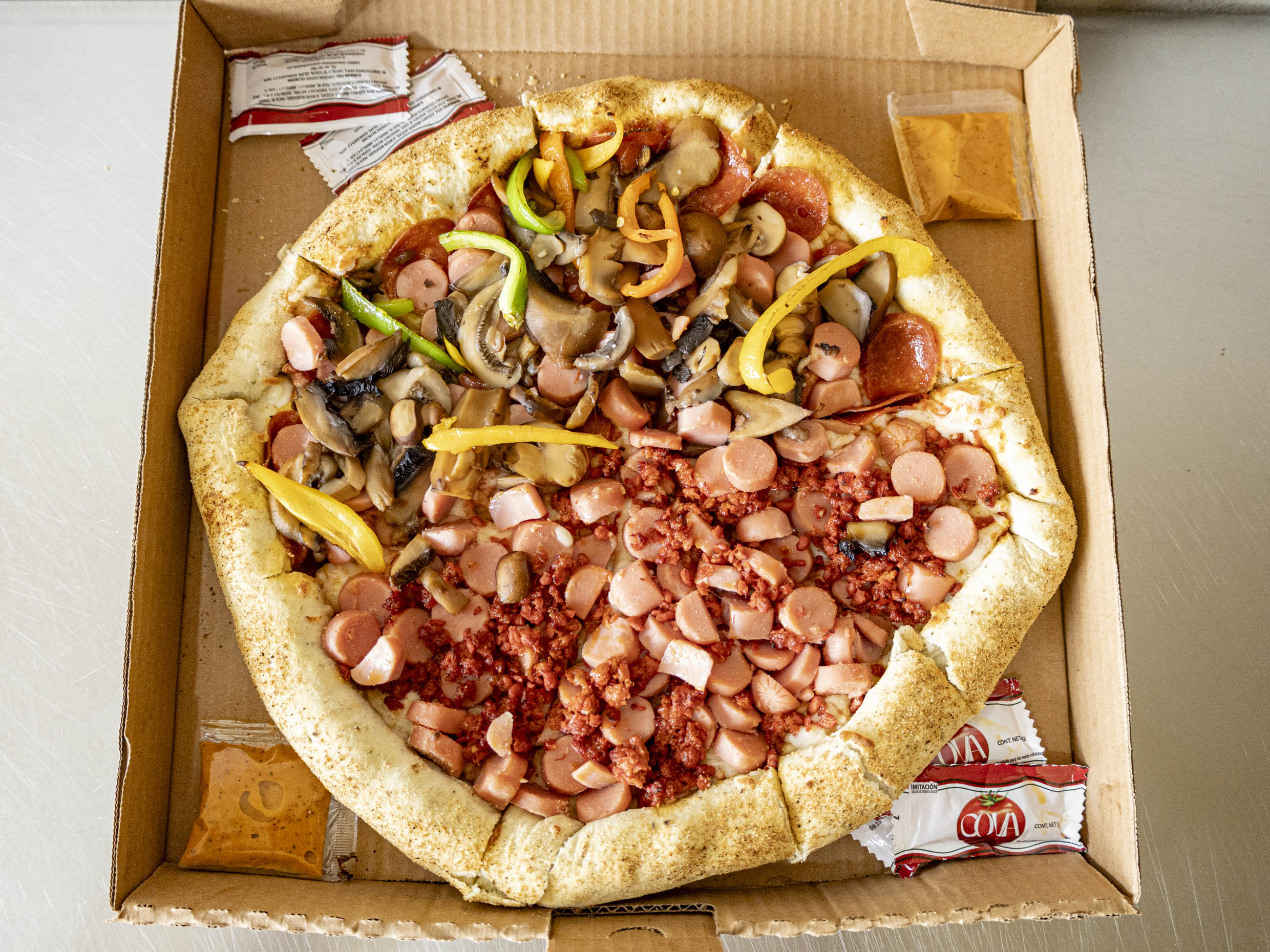 Pizza familair de 10 rebanadas de 36 cm con queso mozarella[mitad pepperoni,salchicha,champiñones y morron] y [mitad chorizo,salchicha y jalapeño]
