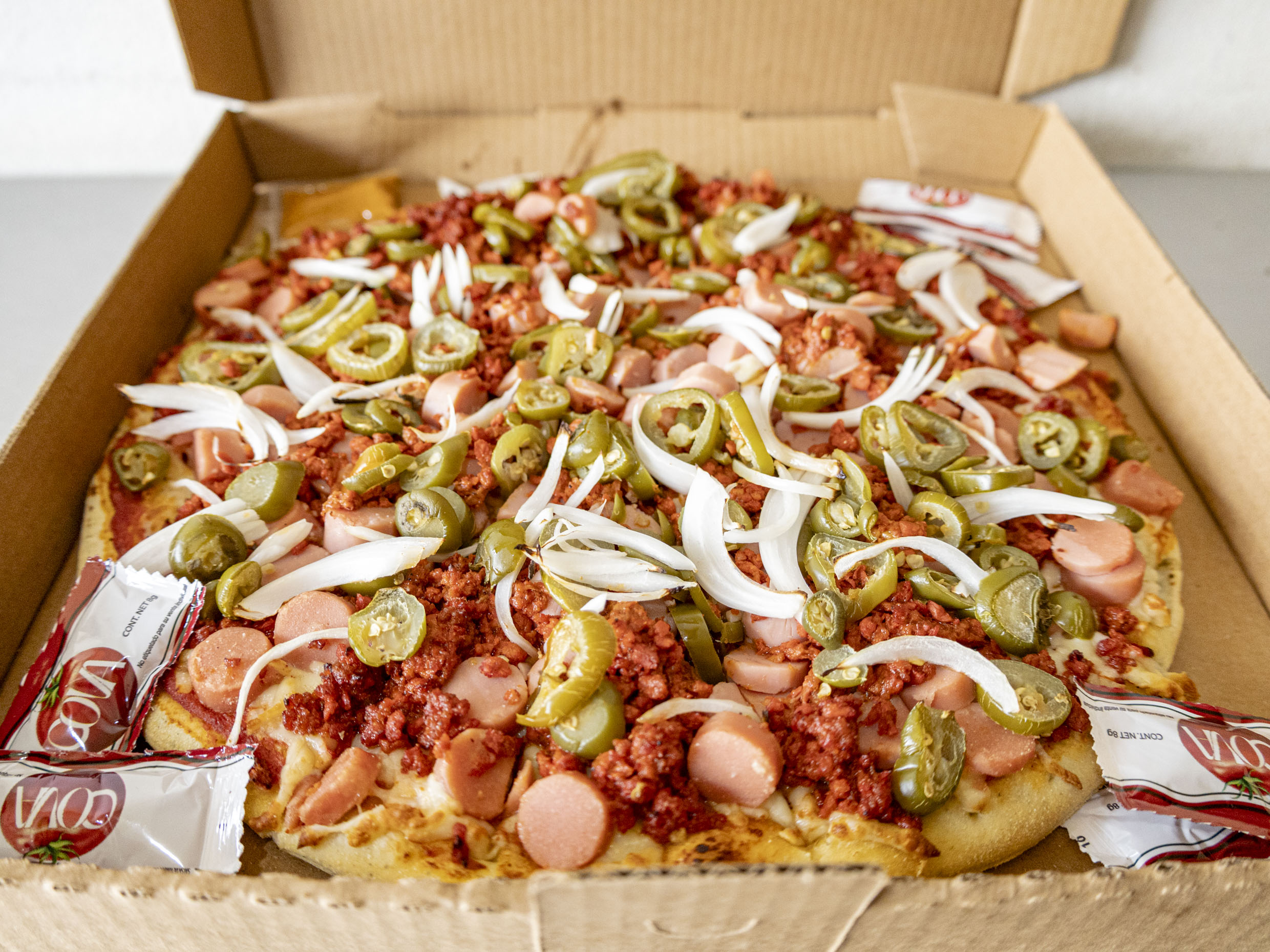 Pizza familair de 10 rebanadas de 36 cm Chorizo,Salchicha,jalapeño y cebolla