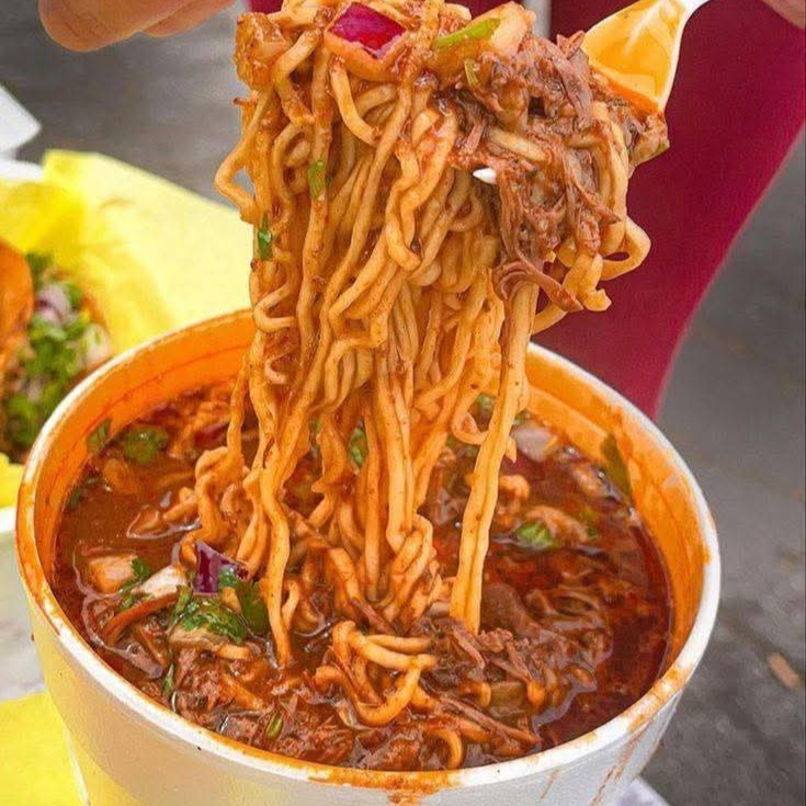 Delicioso cosome con carne de birria y pasta de litro. Acompañado de verduras, limones y salsas.