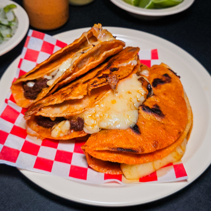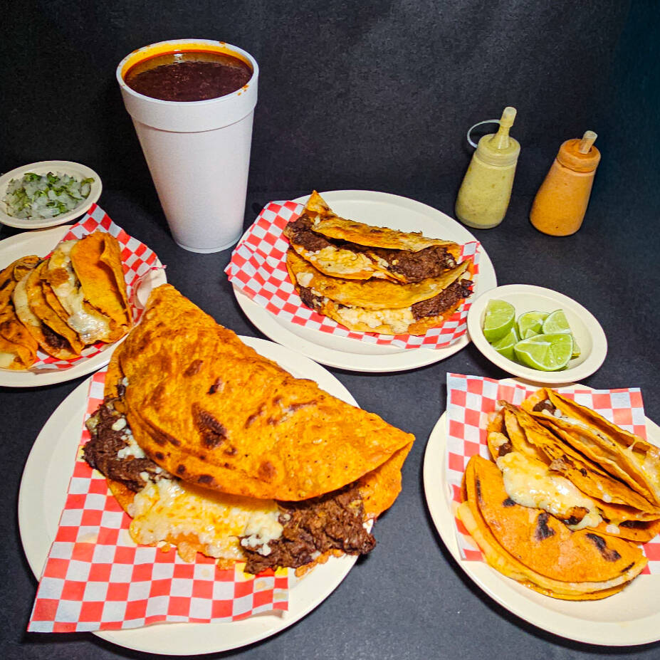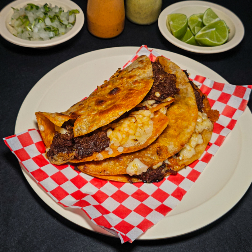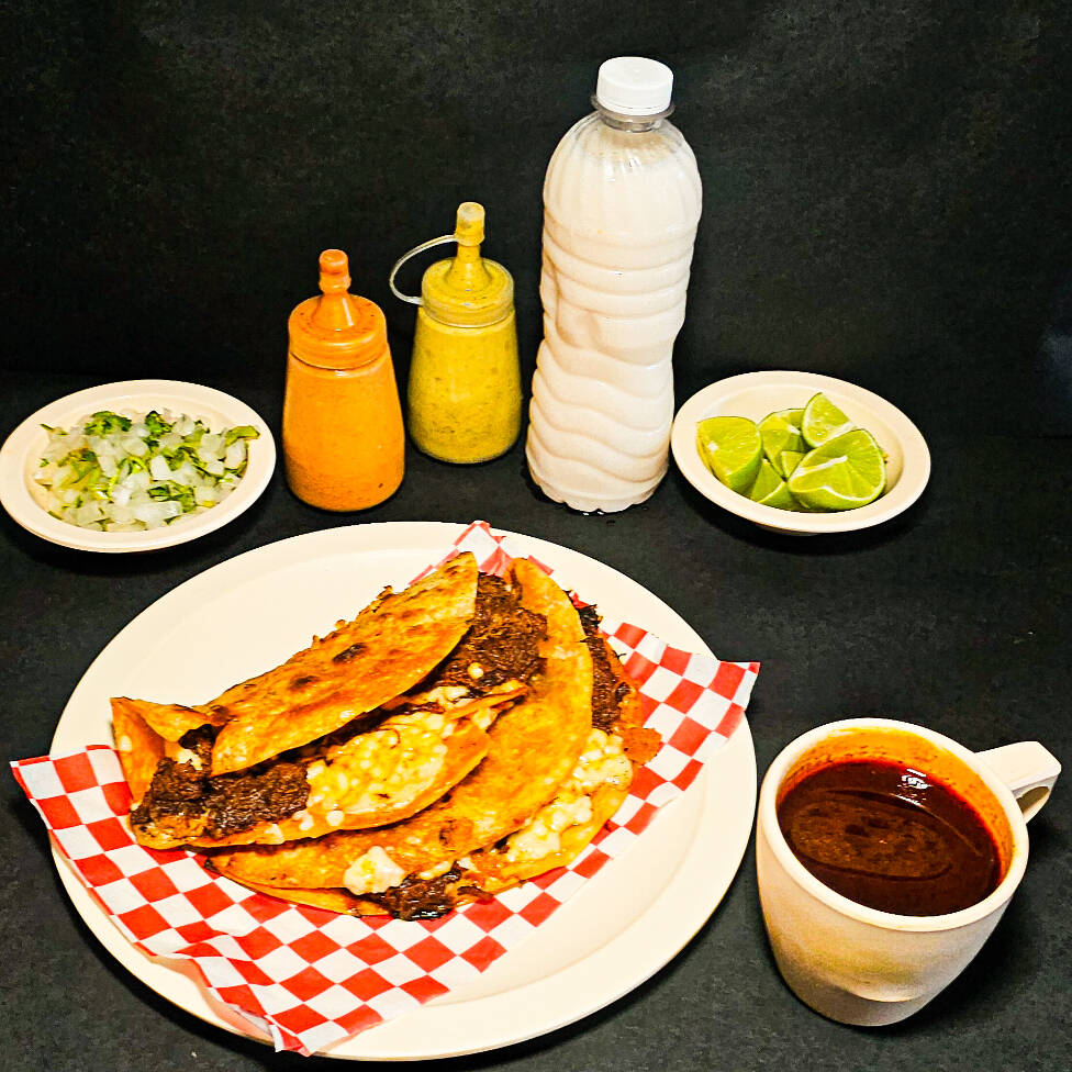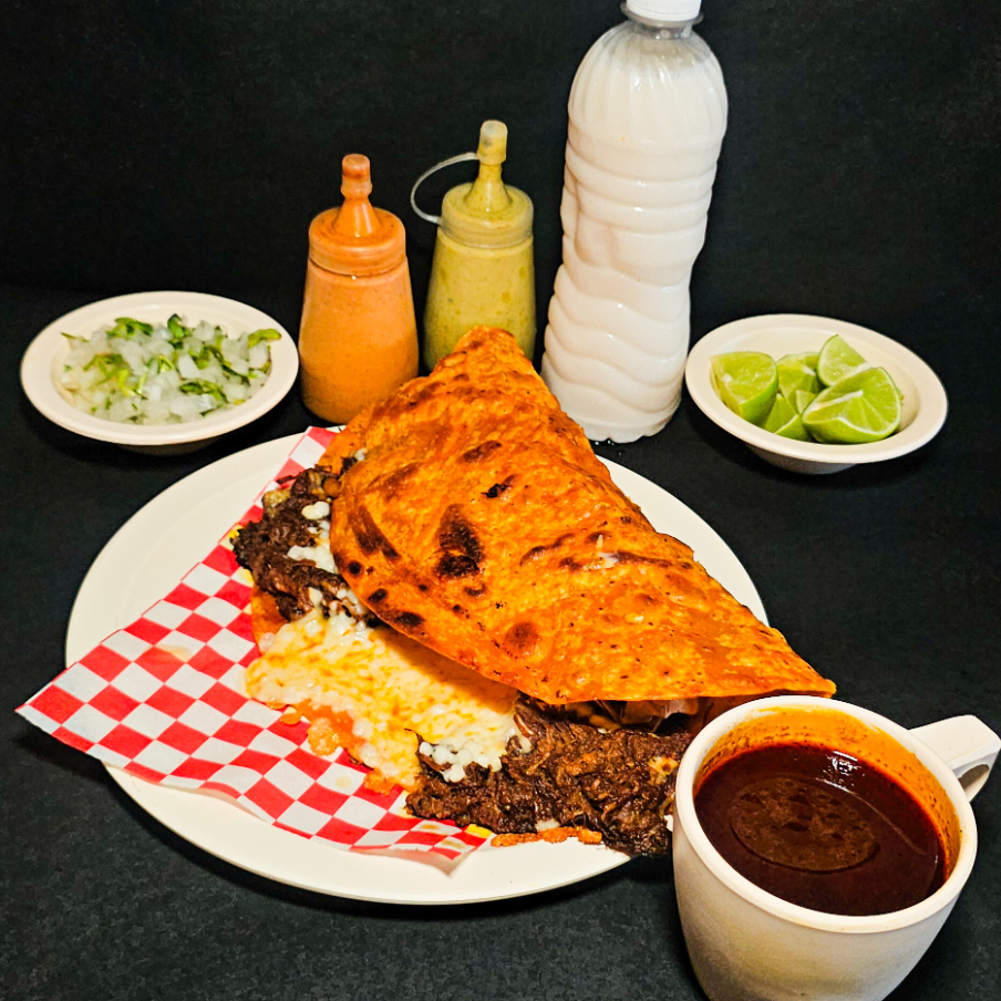 Deliciosa quesadilla rellena de carne de birria con queso gratinado de tortilla de harina casera. Acompañado de verduras, limones y salsas.