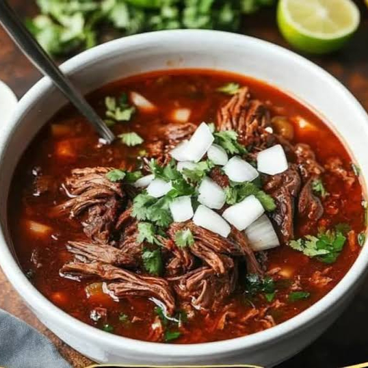 Delicioso consome de birria con carne (125 grm). Acompañado de tortillas, verduras, limones y salsas.