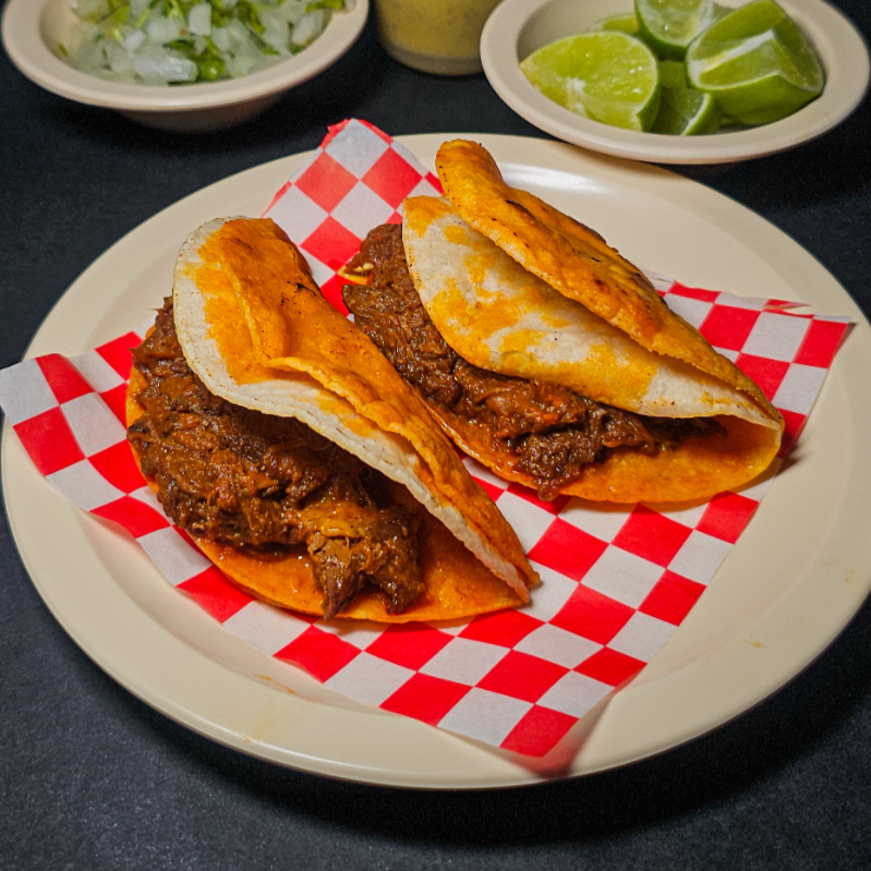 Delicioso taco suave de birria . Acompañado de cebolla y cilantro, limones y salsas.