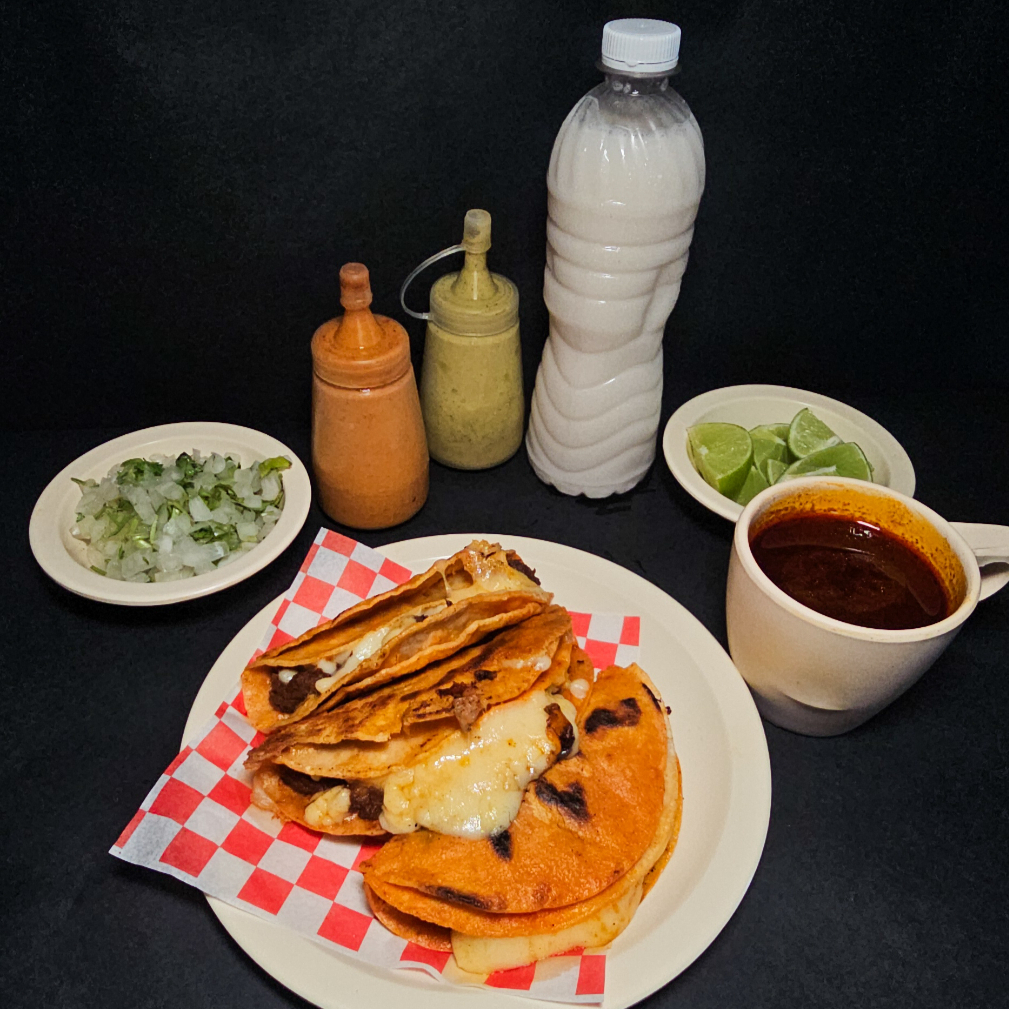 Quesabirria tortilla harina*2 + Agua de horchata medio litro*1 + Vasito de consome 10 oz sin carne*1