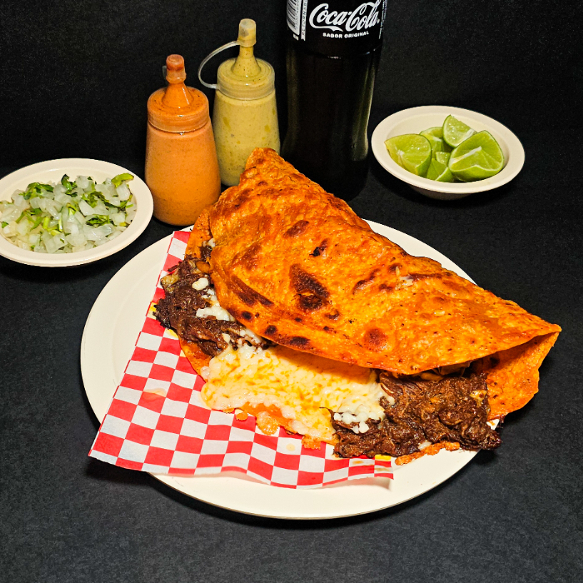 Deliciosa quesadilla de birria con queso gratinado de tamaño JUMBO. Incluye verduras, salsas.