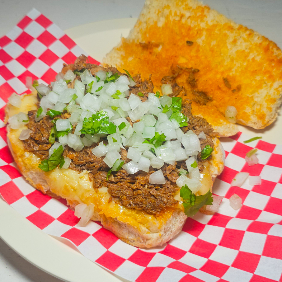 Deliciosa torta de birria con queso gratinado. Incluye salsas, verduras.