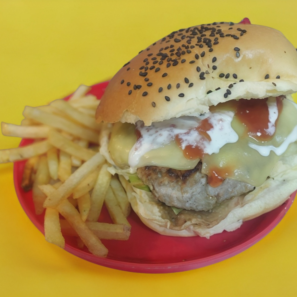 Jugosa Carne de Res y Puerco 100 gr. Acompañada con Queso americano, Lechuga, Jitomate y Papas a la Francesa.
