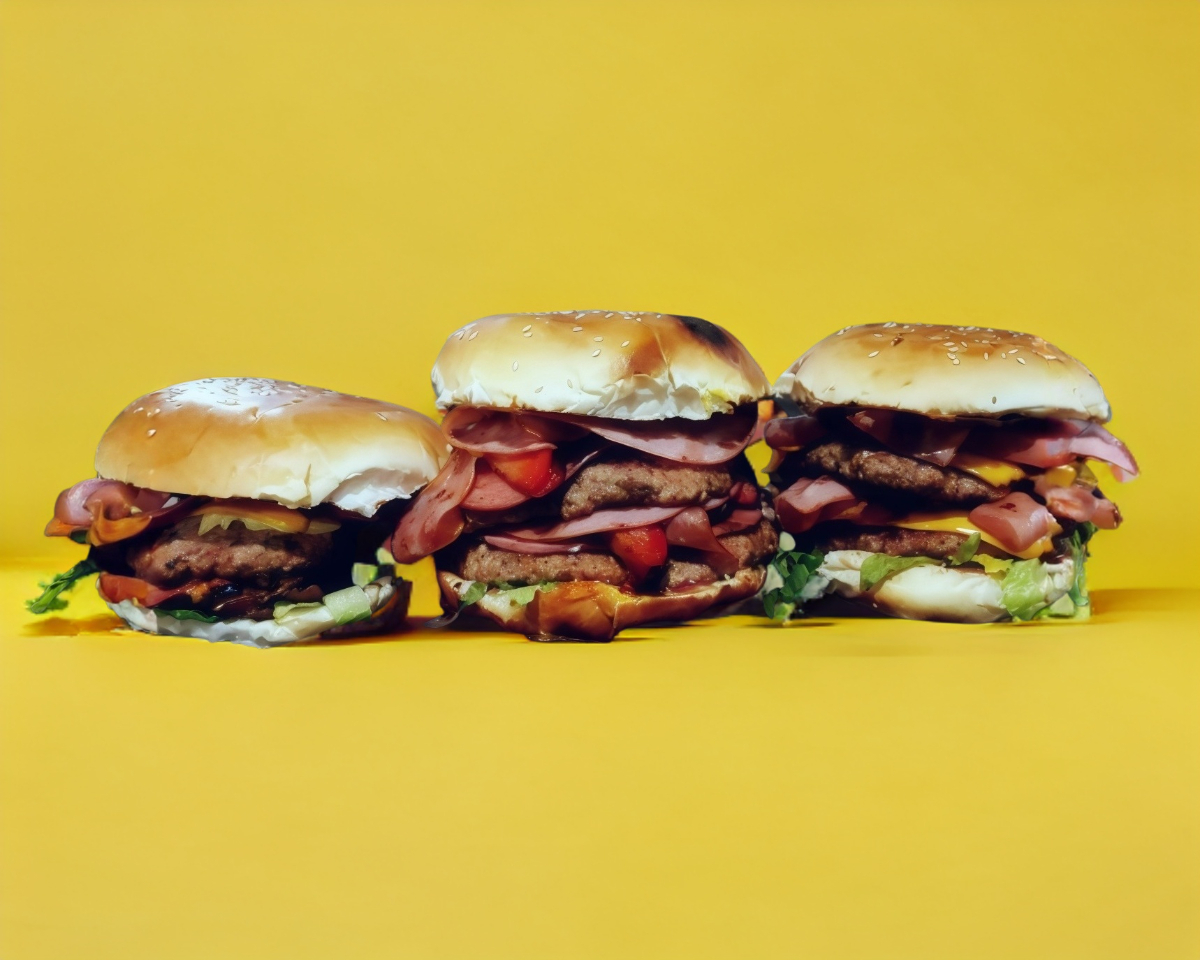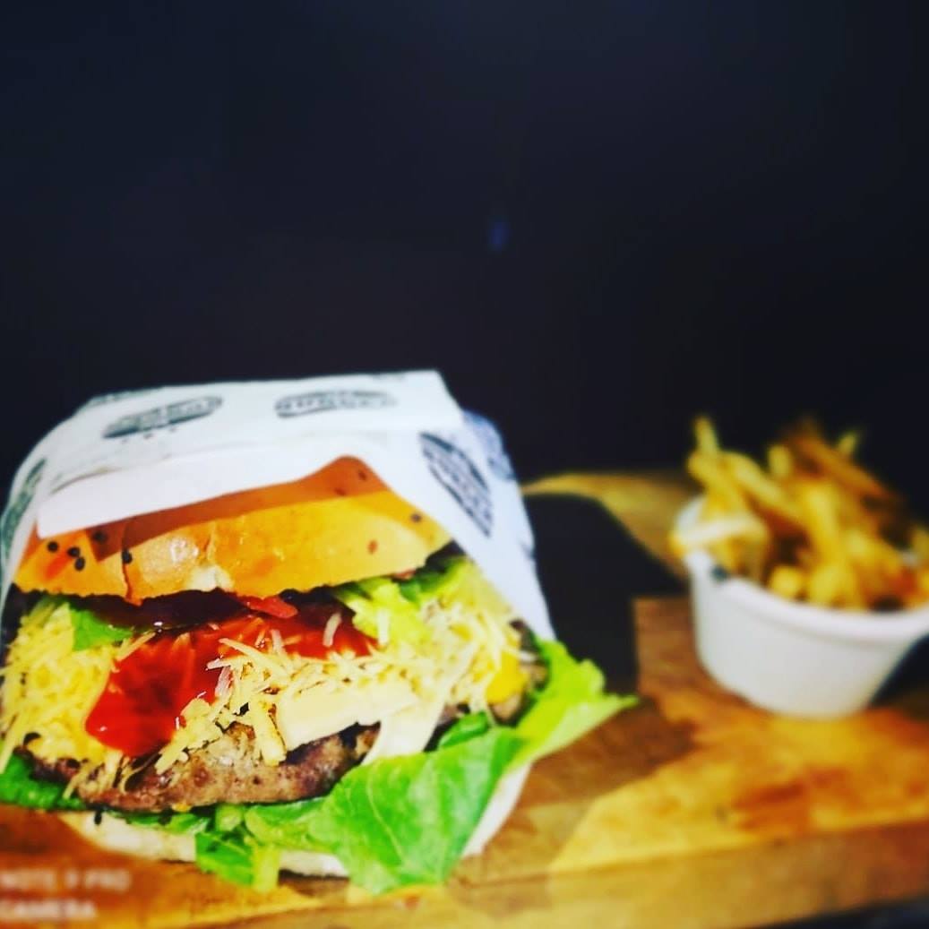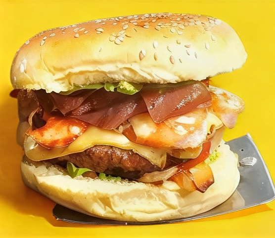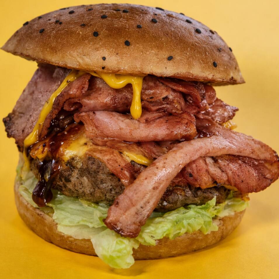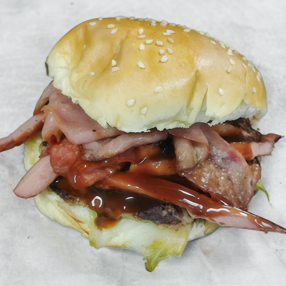 Monstruosa Burger con Triple Carne de Res y Cerdo 170 gr. Con Tocino, Abundante queso americano, Lechuga, Jitomate y Papas a la Francesa.