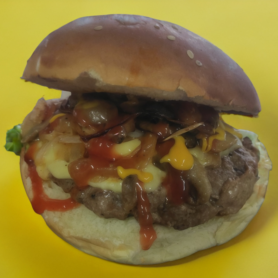 Jugosa Carne de Res y Puerco 170 gr. Acompañada con Queso manchego, Salami, Peperoni, Champiñones, Parmesano, Lechuga, Jitomate y Papas a la Francesa.