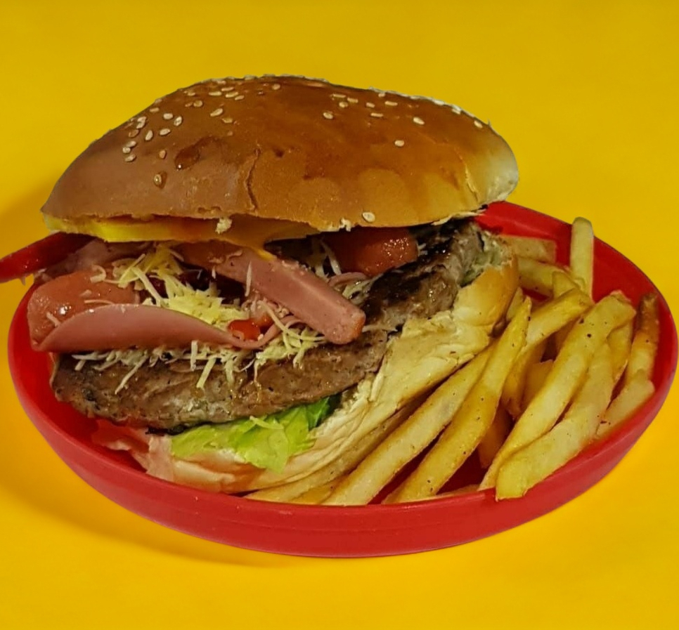 Jugosa Carne de Res y Puerco 170 gr. Acompañada con Queso americano, Tocineta, Salchicha, BBQ, Lechuga, Jitomate y Papas a la Francesa.