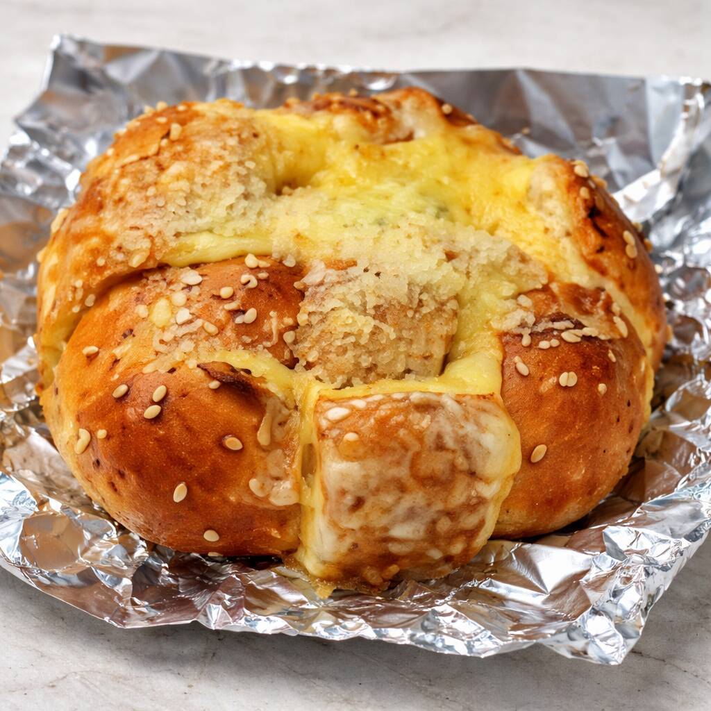 Pieza de Pan con queso manchego gratinado y aceite de ajo.