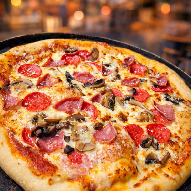 Queso gouda, puré, champiñones, salami, pepperoni y queso parmesano