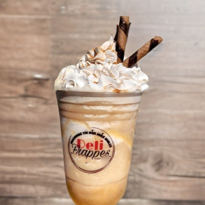 Frappé con crema batida, canela, café y leche deslactosada en vaso de 16oz.
