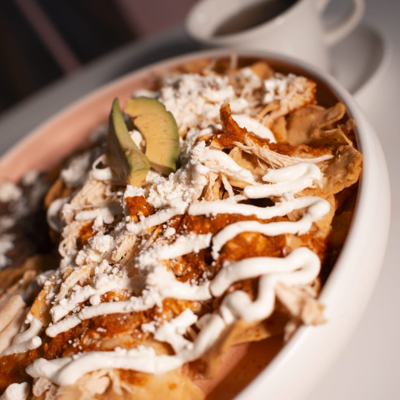 Exquisito guiso con Tortilla frita en salsa, queso, crema, bañados en salsa de tu elección, con pollo, quesadilla y frijol.