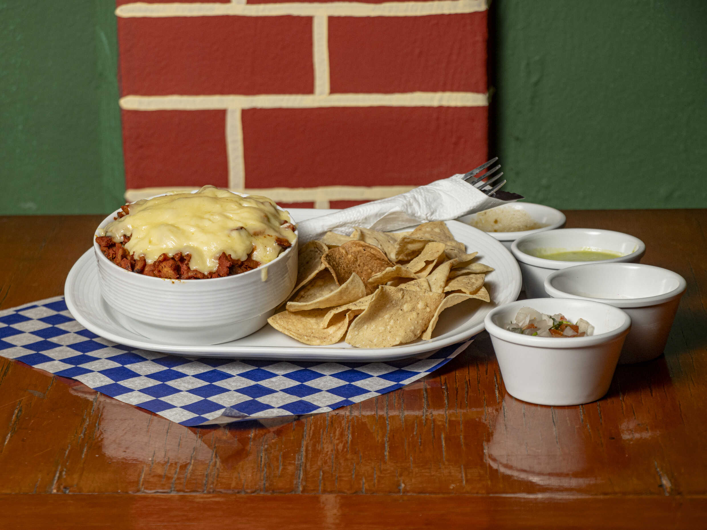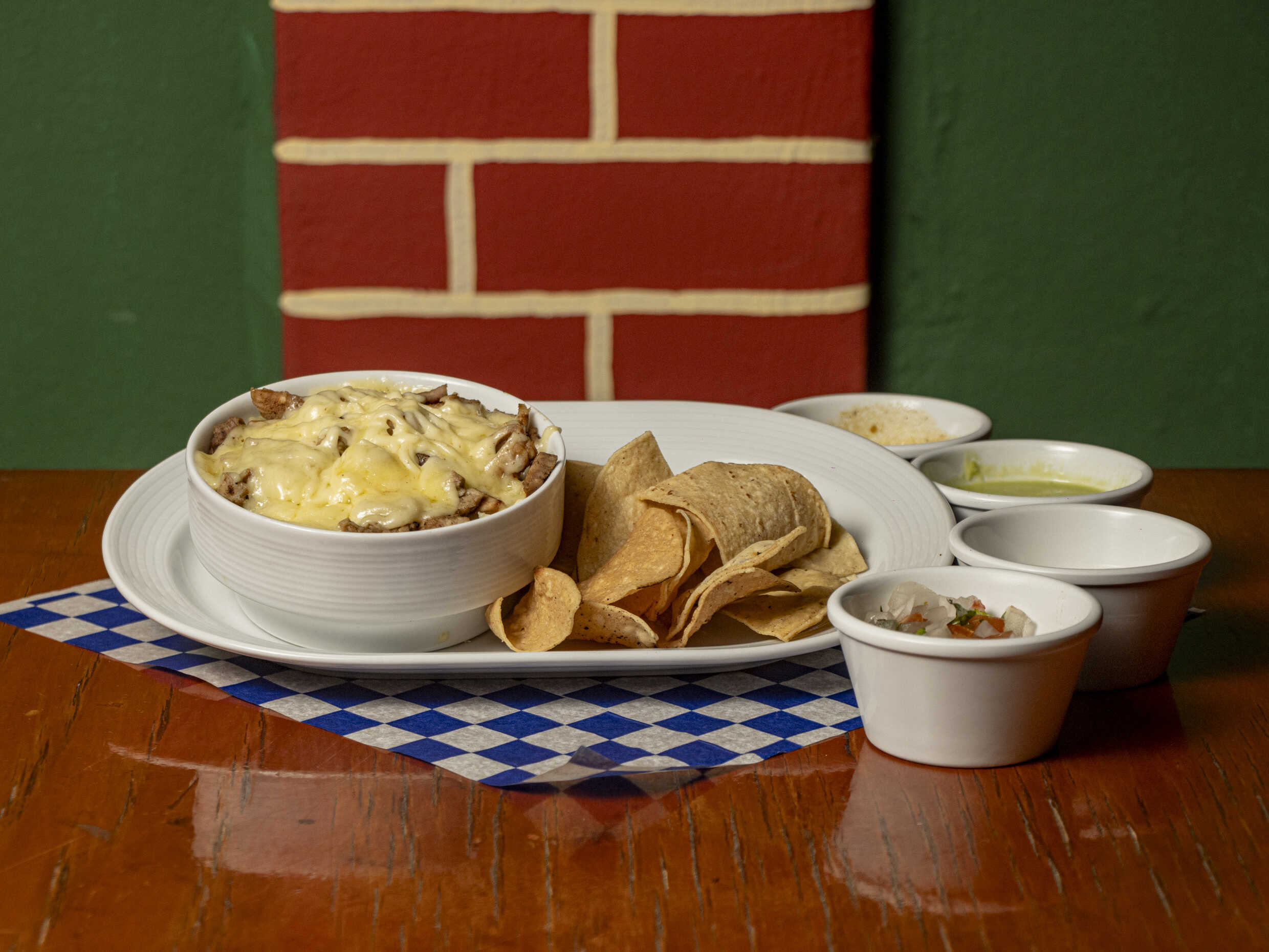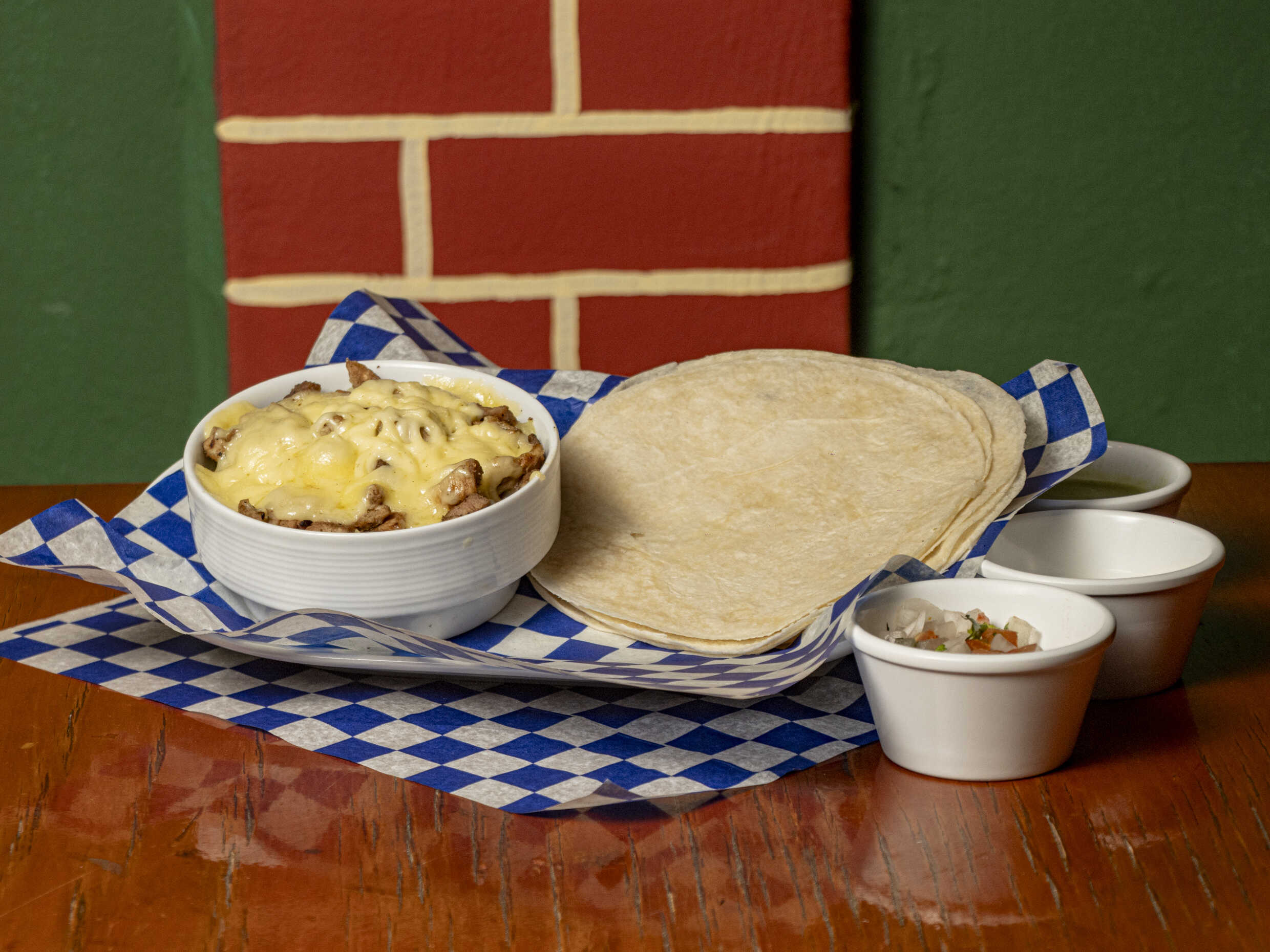 Queso manchego gratinado, carne de su elección, 5 tortillas de harina y salsas.