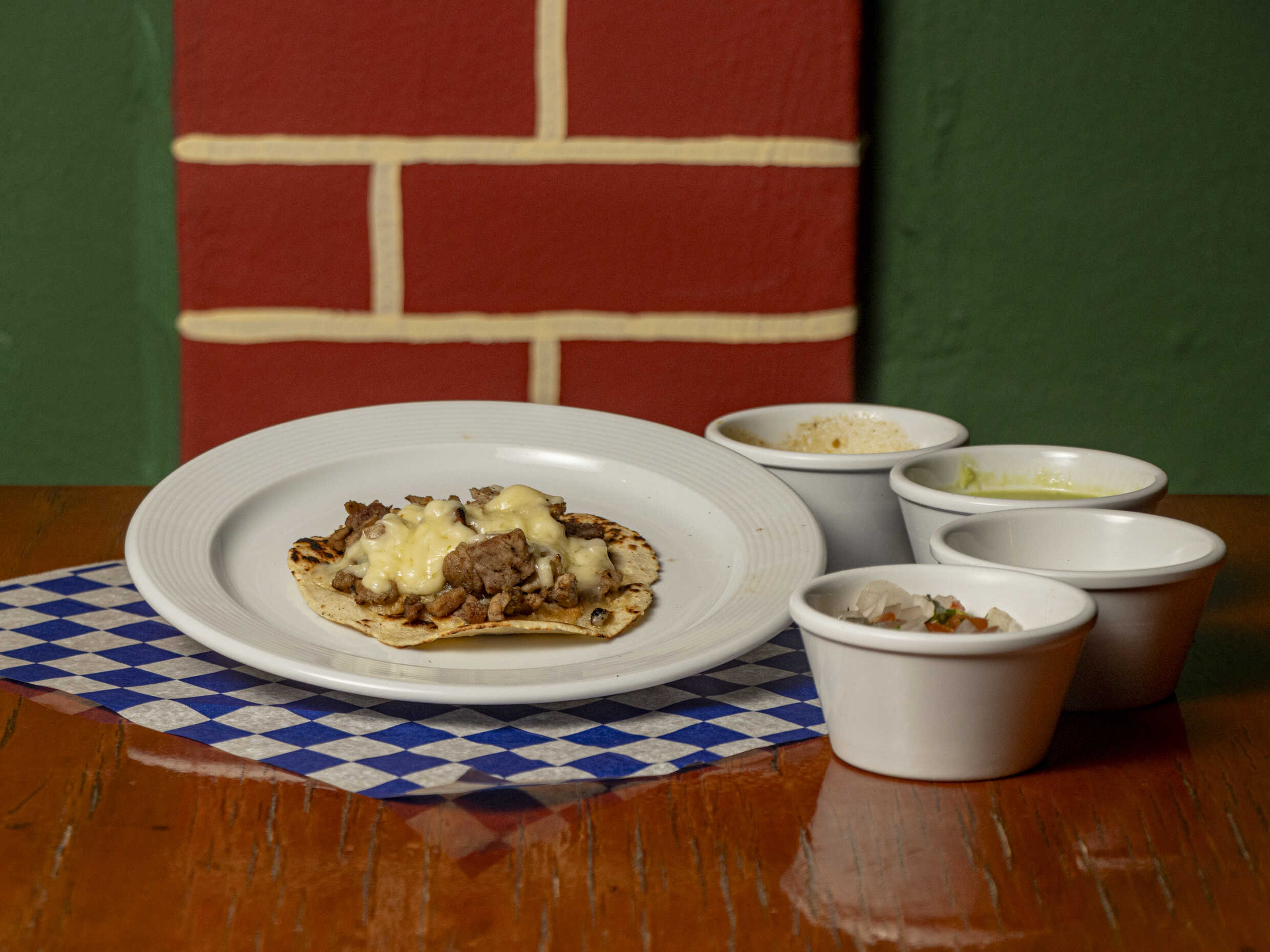 Tortillas hechas a mano con carne y queso incluye salsas.
