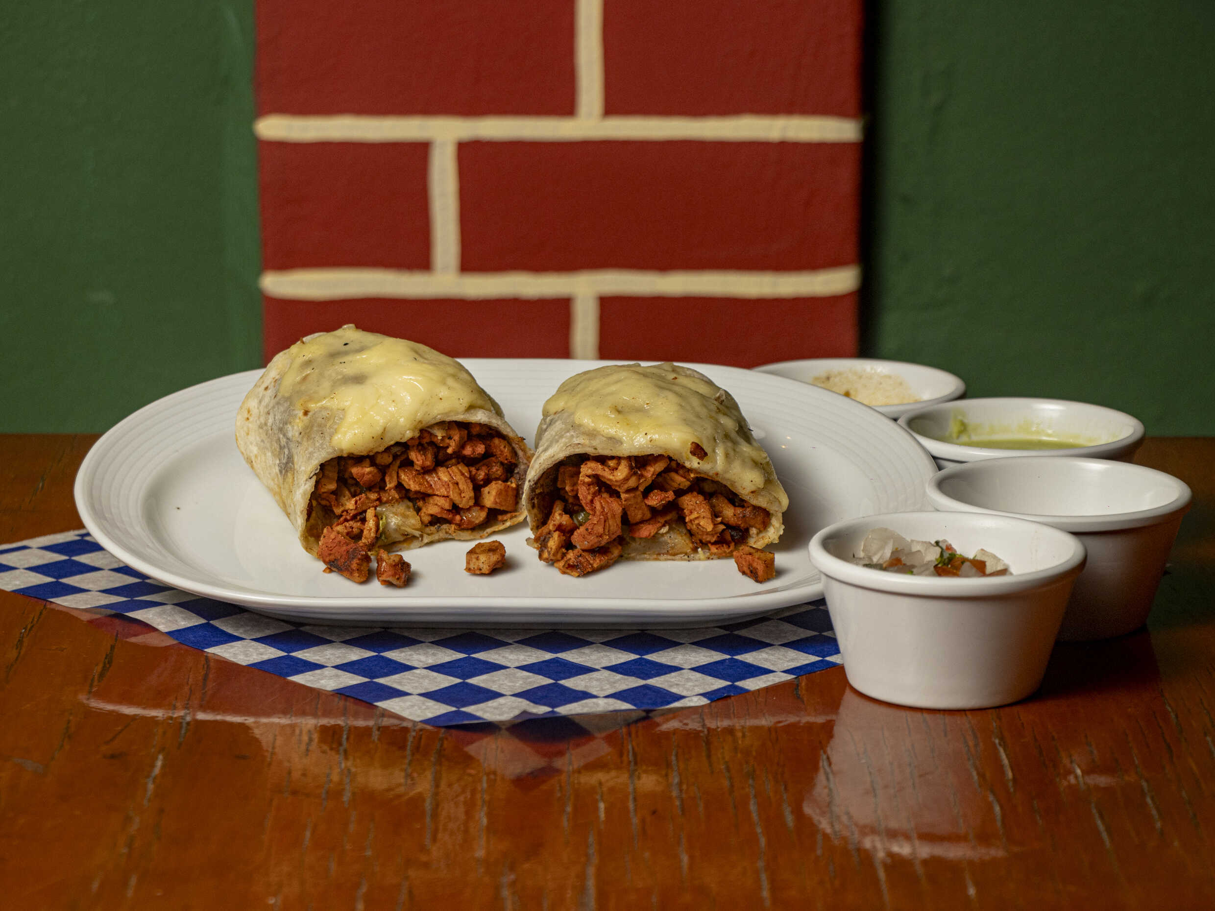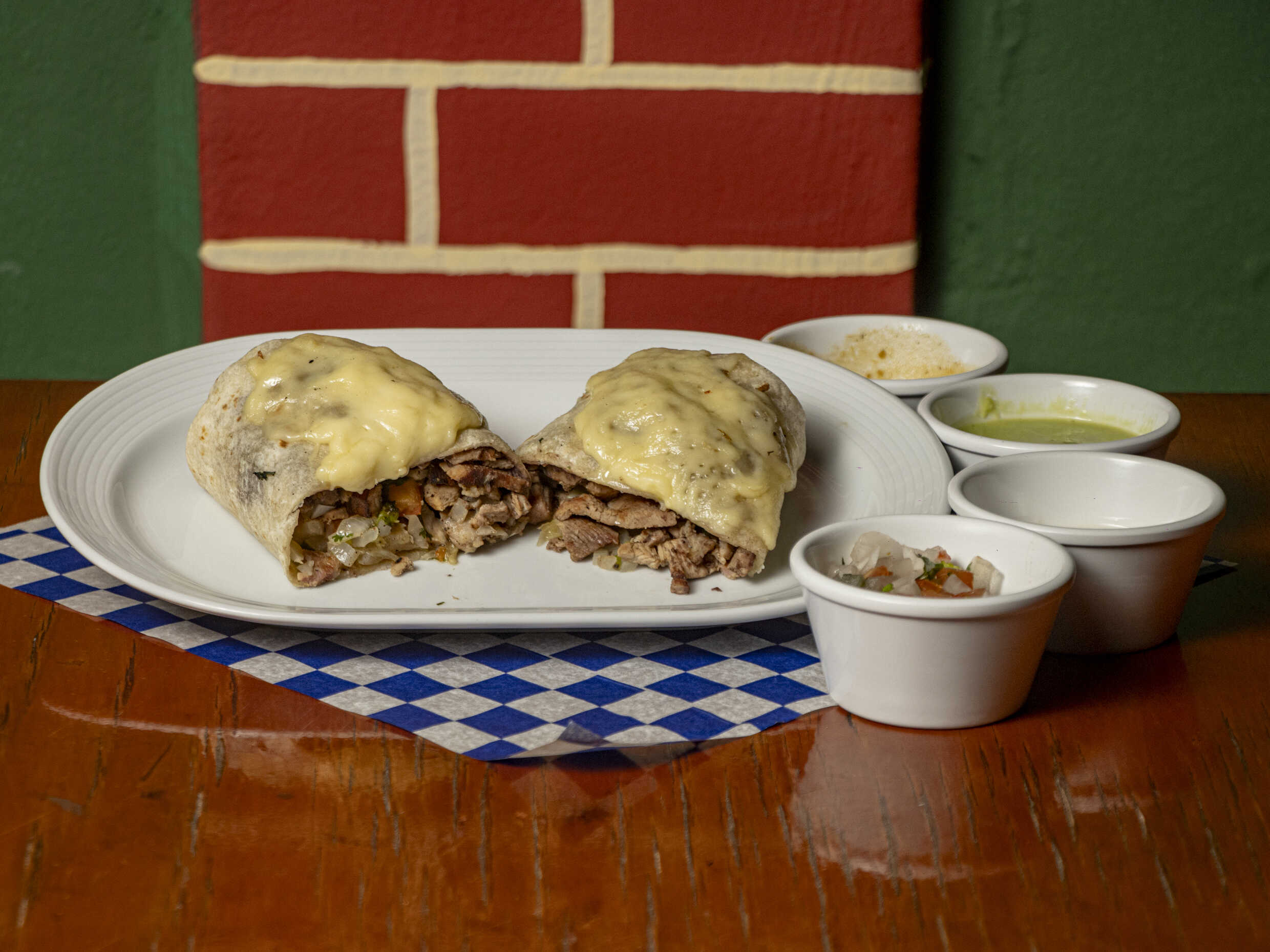 Tortilla de harina grande, frijol, carne de su elección, salsa mexicana, romanita, aguacate, se envuelve y se baña de queso gratinado y salsa especial, incluye salsas.
