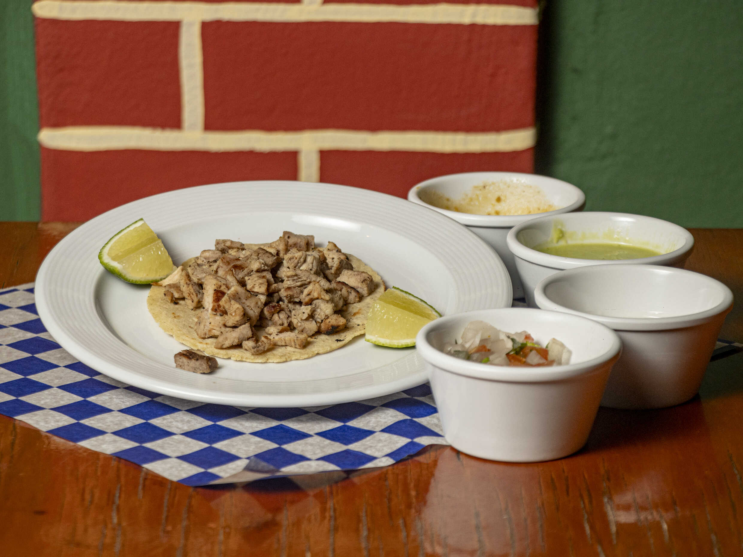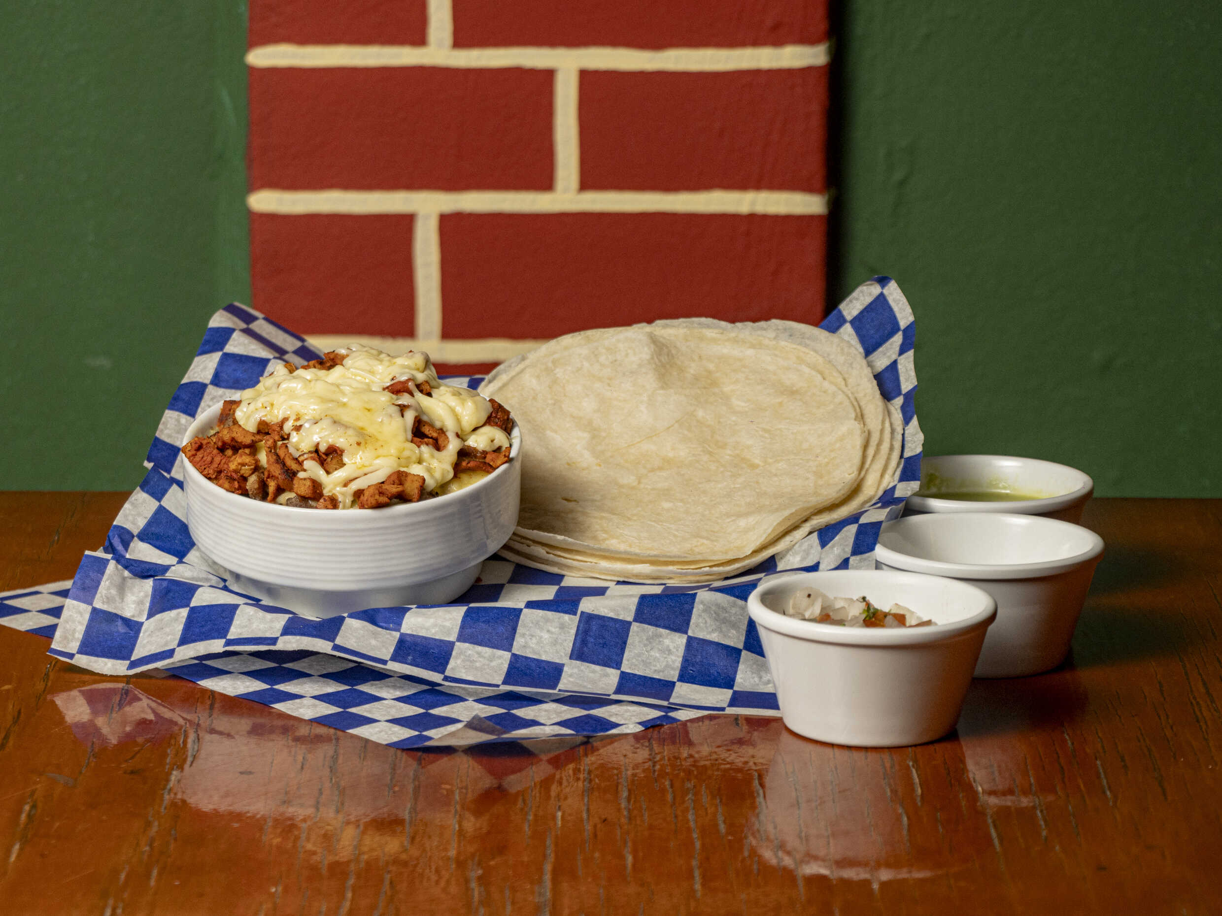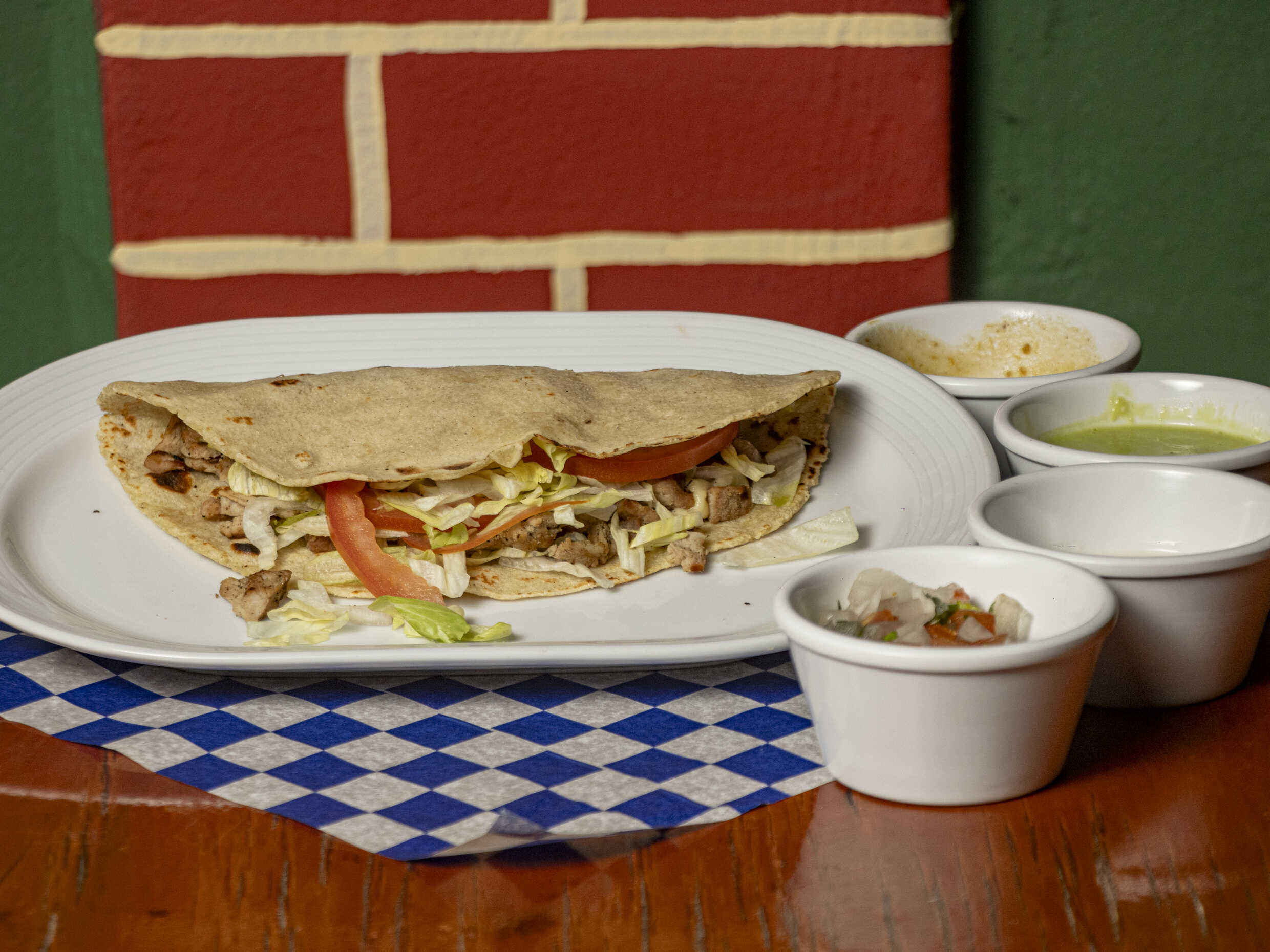 Tortilla de maíz, carne de su elección (100 g), queso manchego y verduras, elige salsas (salsas habanero y salsa verde).