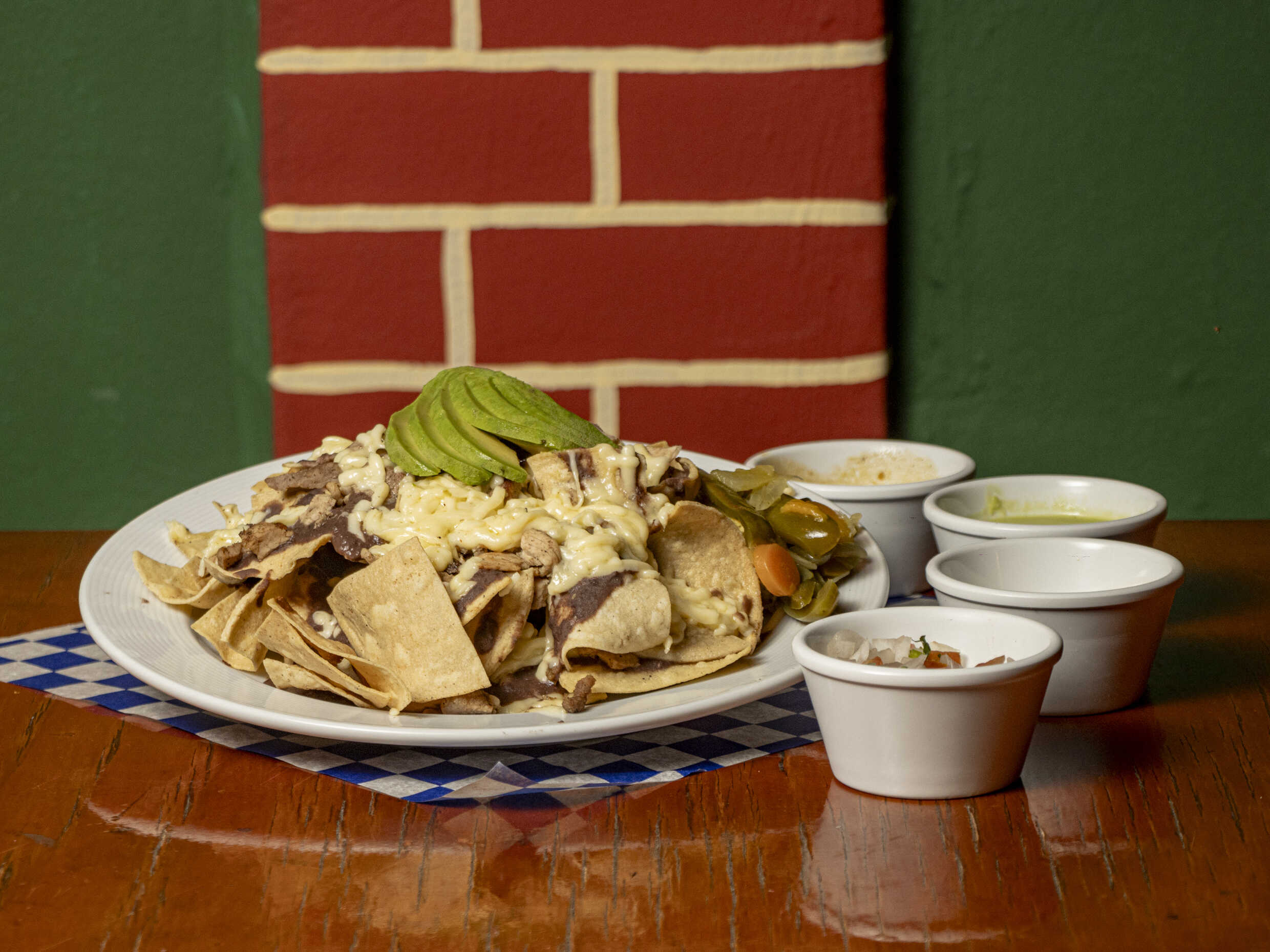 2 Bases de "totopos, frijol, carne de su elección, queso manchego" jalapeños y lascas de aguacate (incluye salsas).