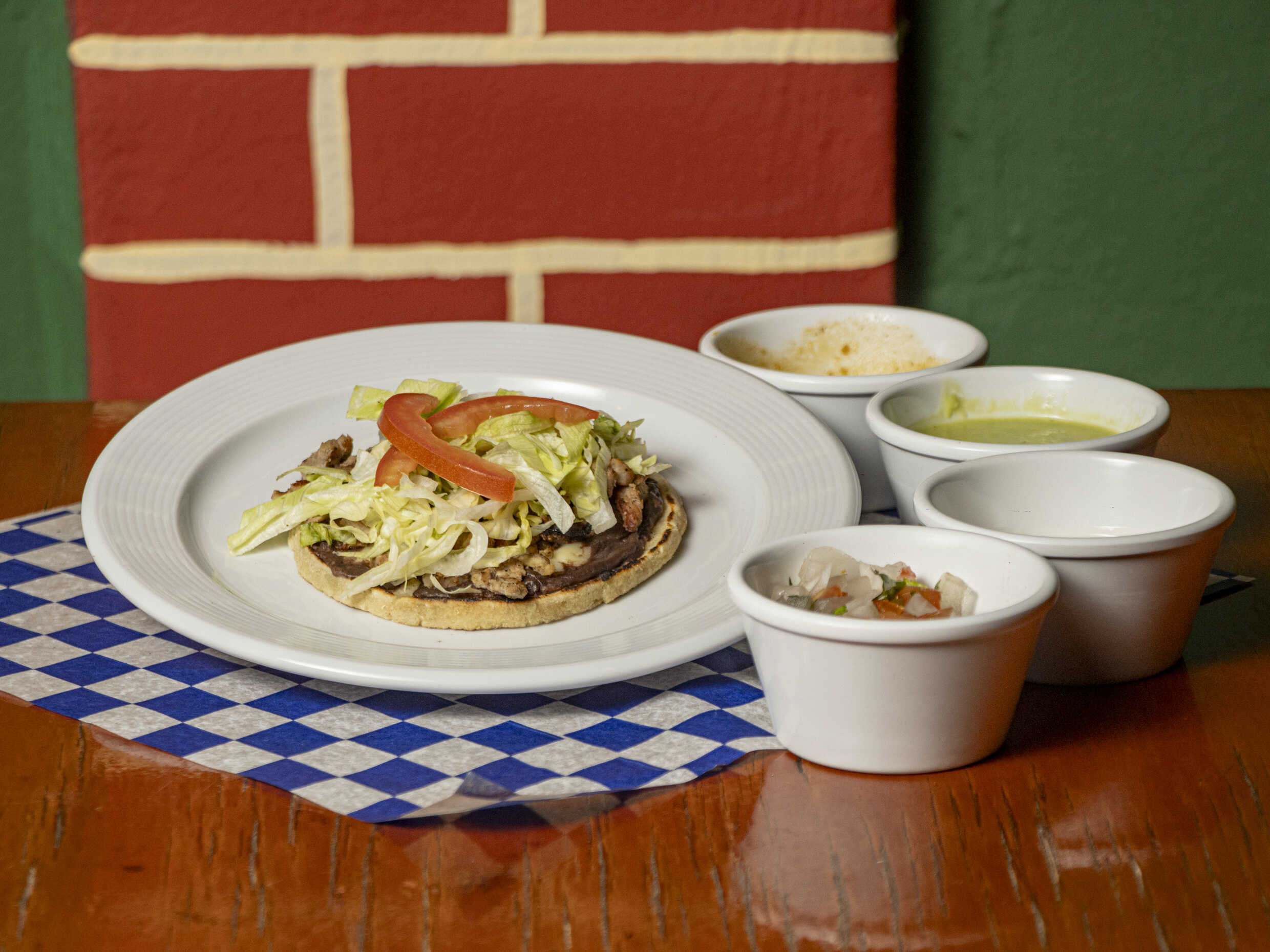 Tortilla de maíz, frijol, queso manchego, carne de su elección, verduras y queso de bola.