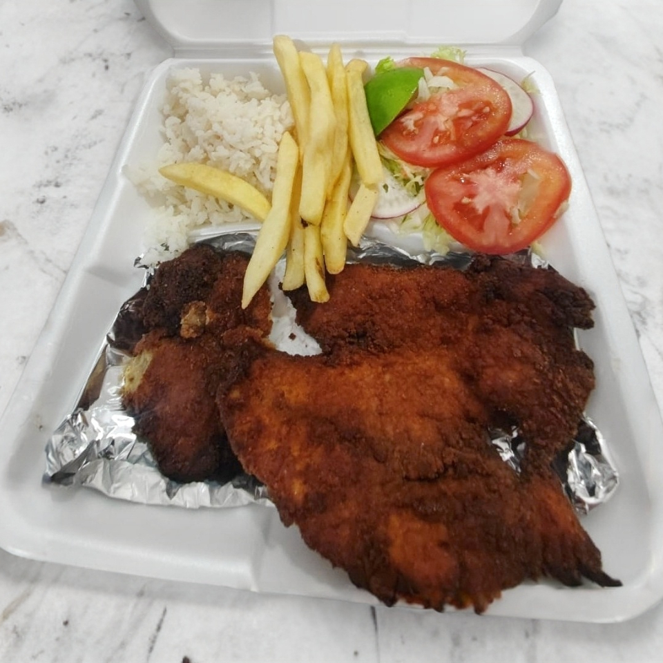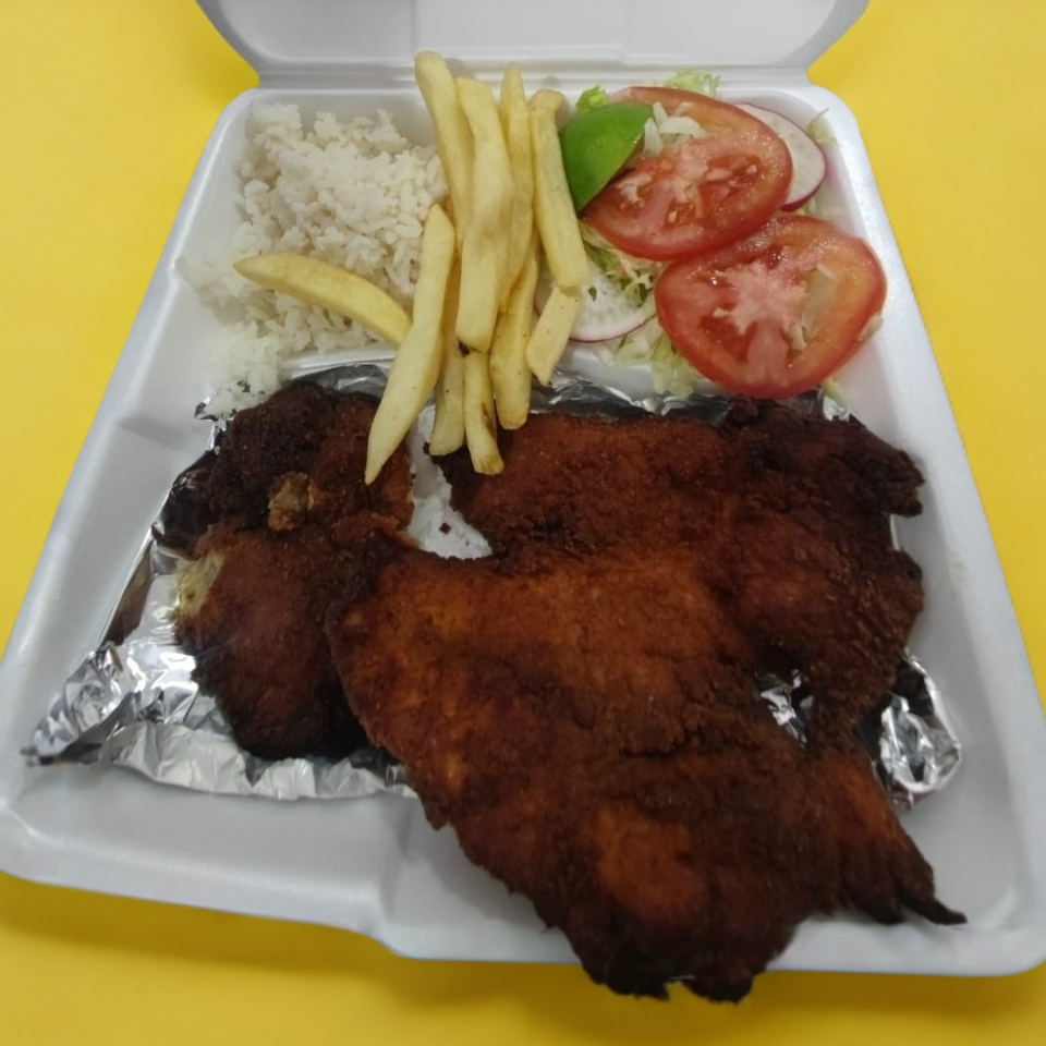 MILANESITA DE POLLO EMPANIZADA, ACOMPAÑADA DE FRIJOL Y PAPAS A LA FRANCESA, INCLUYE JUGO DE CAJITA.