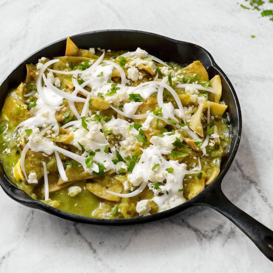 CHILAQUILES EN SU SALSA DE TOMATE VERDE , LLEVAN CEBOLLA CREMA Y QUESO.