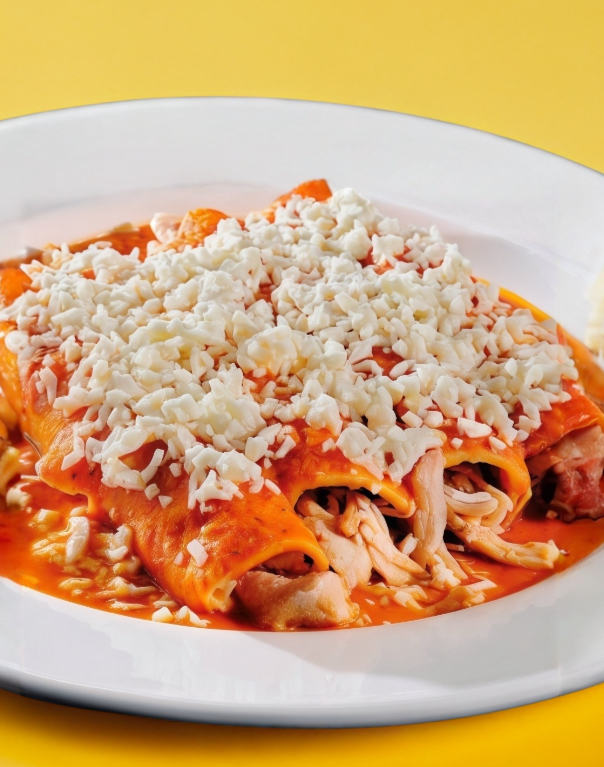 SEIS TORTILLAS PASADAS POR ACEITE, ENROLLADAS Y BAÑADAS EN FRIJOL COLADO, CUBIERTAS CON QUESO FRESCO, CREMA, CEBOLLA Y POLLO A LA PLANCHA.