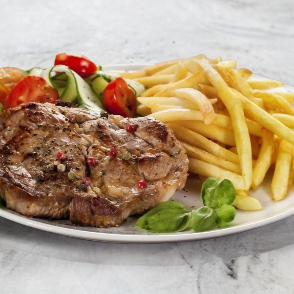 MILANESITA DE CERDO EMPANIZADA, ACOMPAÑADA DE FRIJOL Y PAPAS A LA FRANCESA, INCLUYE JUGO DE CAJITA.