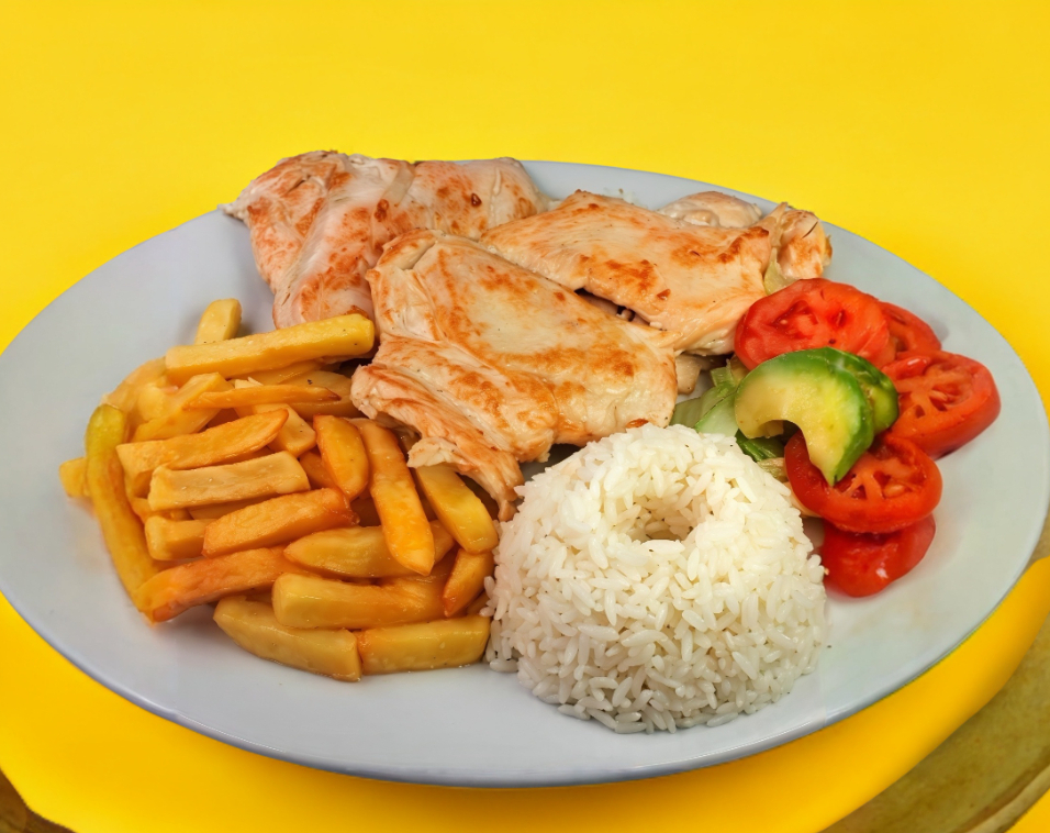 POLLO A LA PLANCHA ACOMPAÑADA DE ENSALADA DE LECHUGA Y TOMATE, FRIJOL, ARROZ BLANCO Y SOPA.
