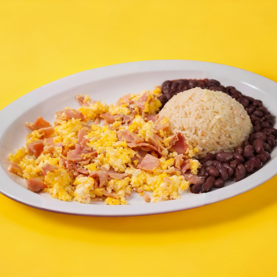 HUEVOS REVUELTOS CON JAMON, ACOMPAÑADOS DE FRIJOLITOS Y JUGO DE CAJITA.