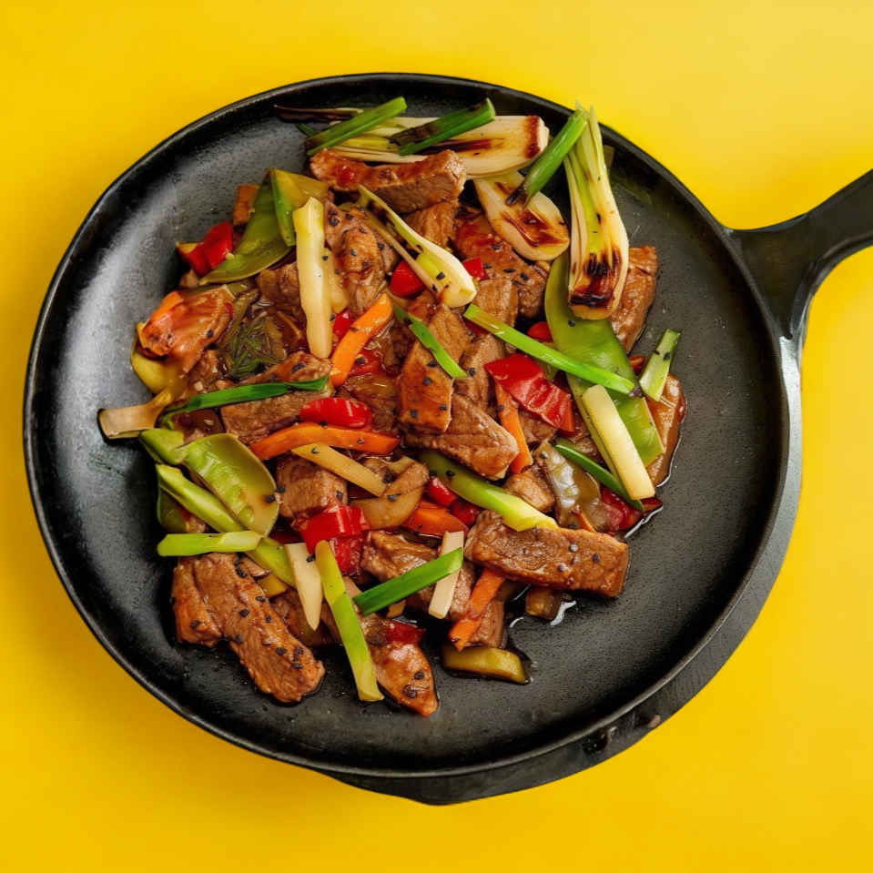 TIRAS DE CARNE DE CERDO SALTEADAS CON PIMIENTO MORRÓN Y CEBOLLA, SAZONADAS AL ESTILO CASERO, ACOMPAÑADAS DE ARROZ Y FRIJOLES.