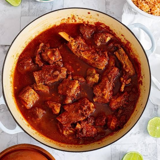 COSTILLAS DE CERDO BAÑADAS EN UNA DELICIOSA SALSA ROJA PREPARADA CON CHILE GUAJILLO Y ESPECIAS, ACOMPAÑADAS DE ARROZ BLANCO Y FRIJOL.