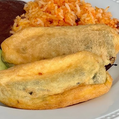 ORDEN DE 2 CHILES JALAPEÑOS RELLENOS DE QUESO, CAPEADOS, ACOMPAÑADOS DE ARROZ ROJO, ENSALADA, LIMON Y FRIJOLES.