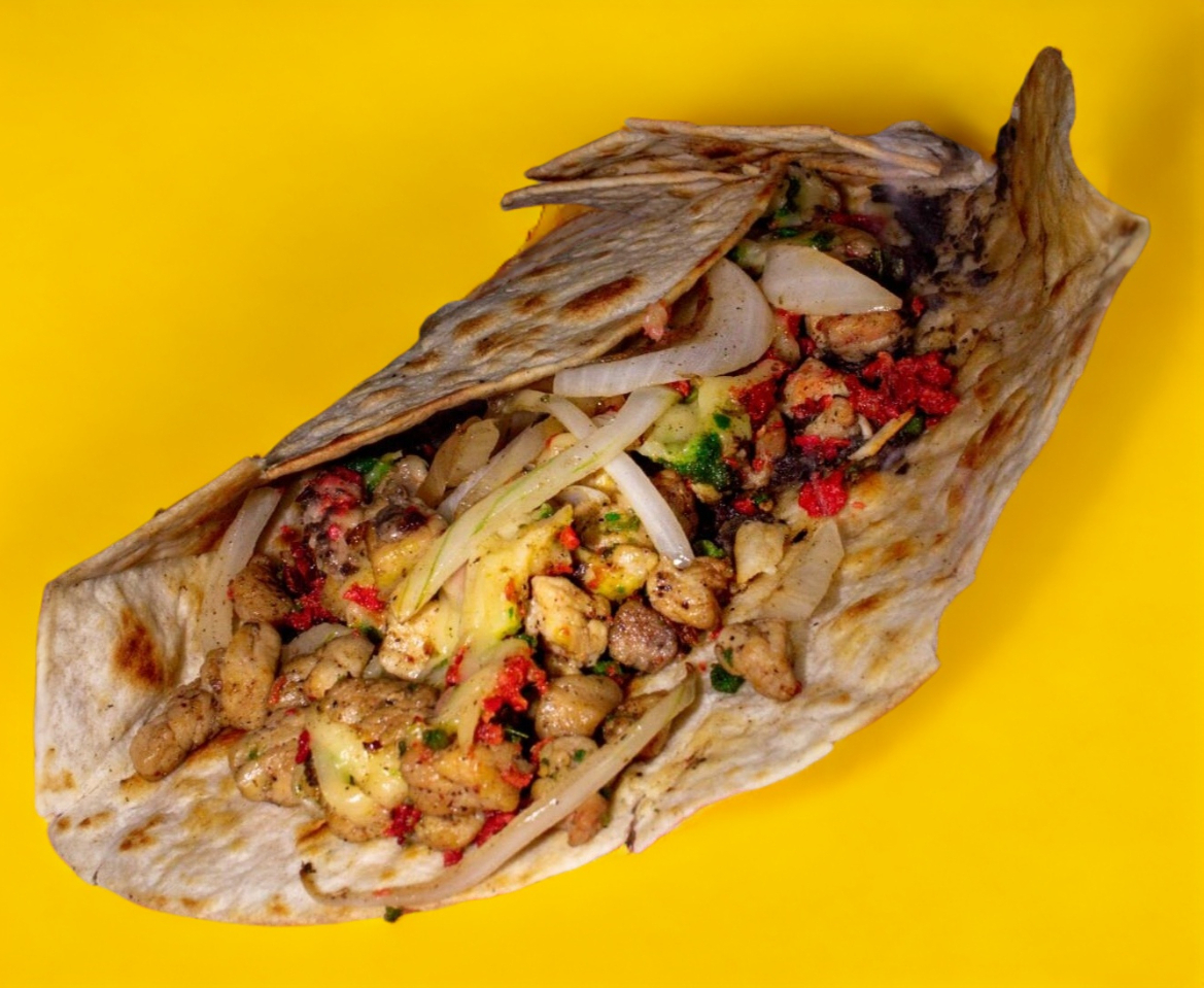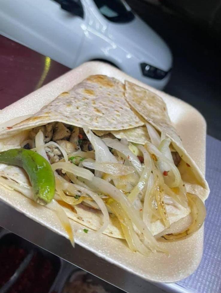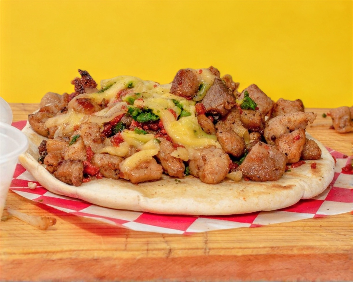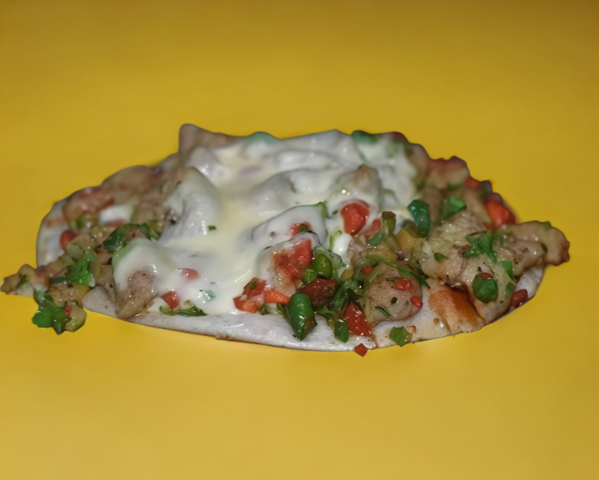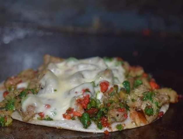 Tortilla de pan pita de 20 cm aproximadamente. Con nuestra carne tipo arabe (carne de puerco chorizo verde chorizo rojo), queso gratinado y cebolla carmelizada.