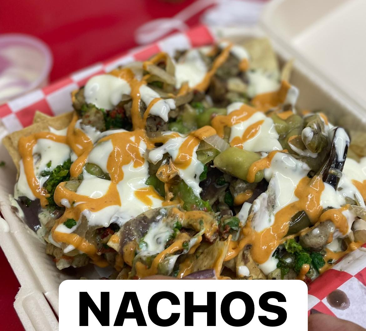 Totopos bañados en frijol y crema de cilantro con carne tipo arabe por encima y queso gratinado.