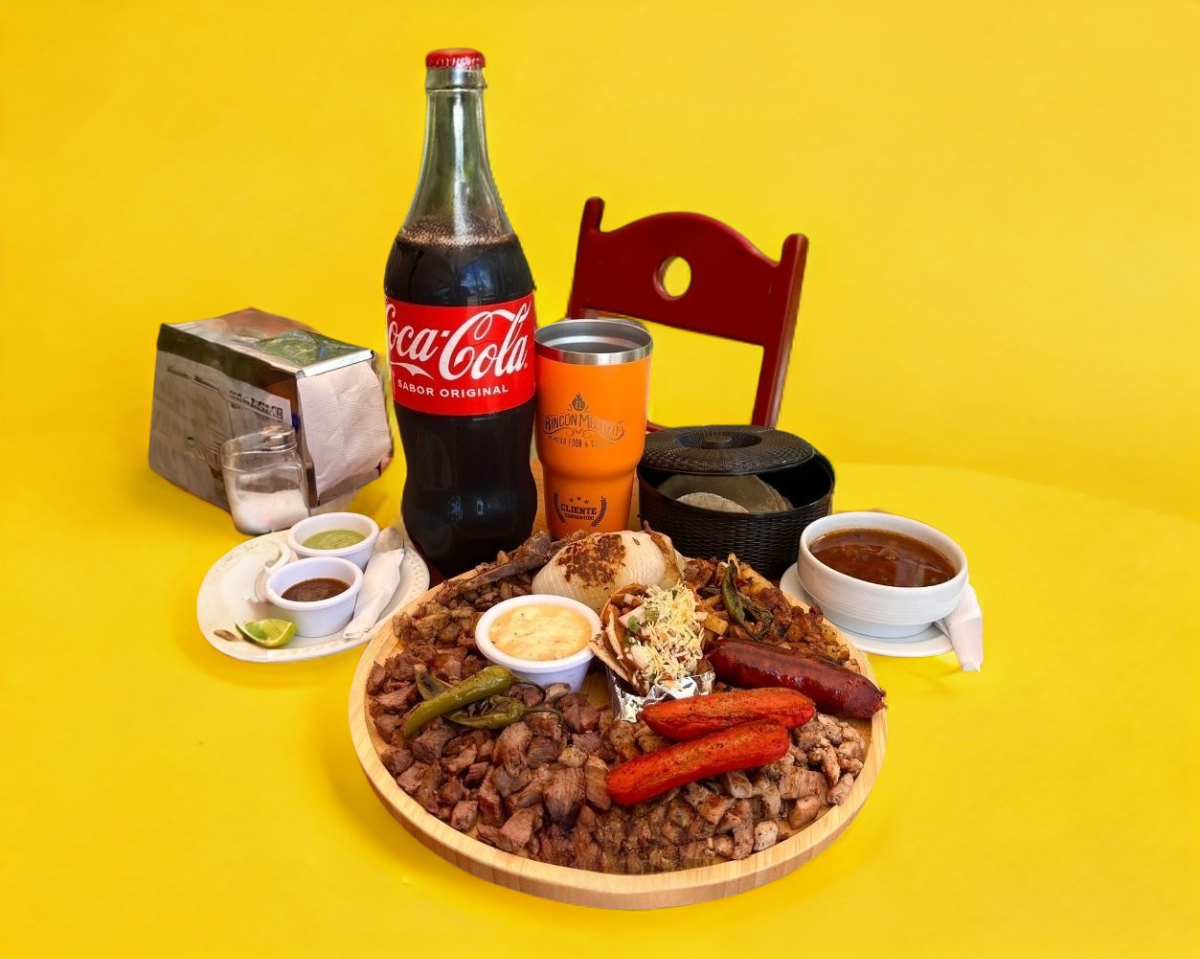 Arrachera, poc chuc, salchicha asada, chorizo, queso fundido,. frijoles charros, cebolla asada, chiles toreados, tortillas y salsas.